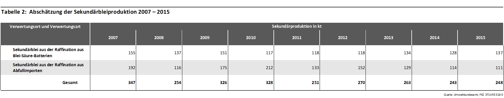 Tabelle 2: Abschätzung der Sekundärbleiproduktion 2007 – 2015