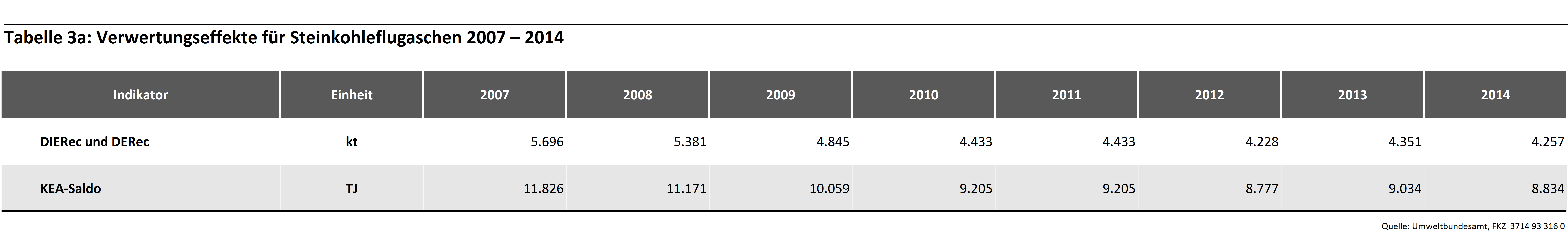 Tabelle 3: Verwertungseffekte für Steinkohleflugaschen 2007 – 2014