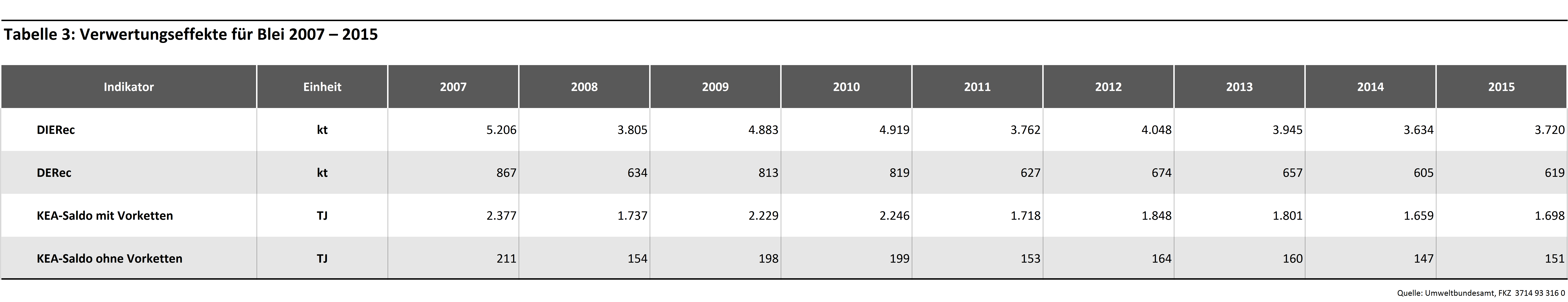 Tabelle 3: Verwertungseffekte für Blei 2007 – 2015