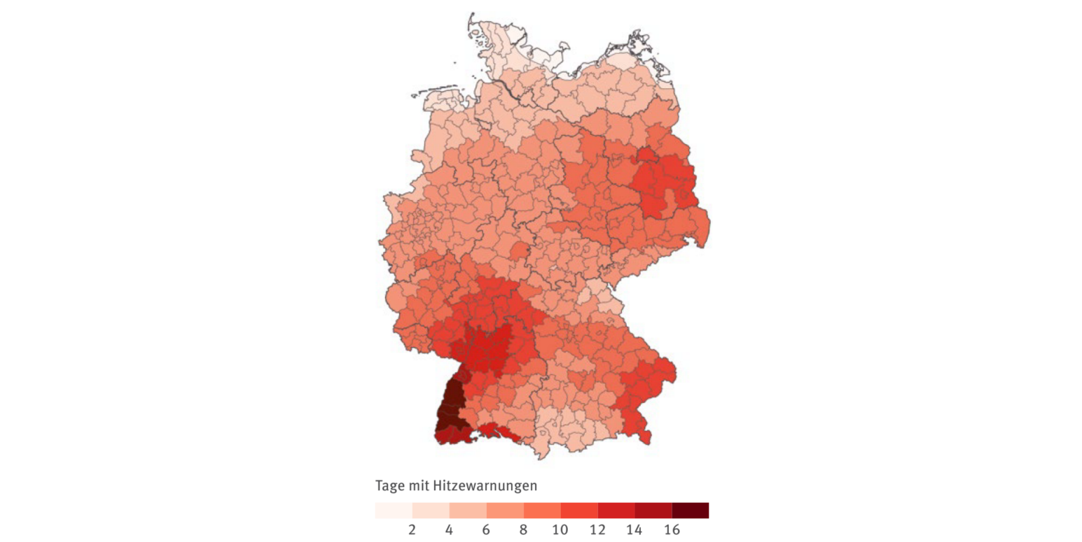 Der Südwesten entlang des Oberrheingrabens ist der Hitze-Hotspot Deutschlands. Hier gab es im letzten 5-Jahresmittel an 12 bis über 16 Tagen Hitzewarnungen.