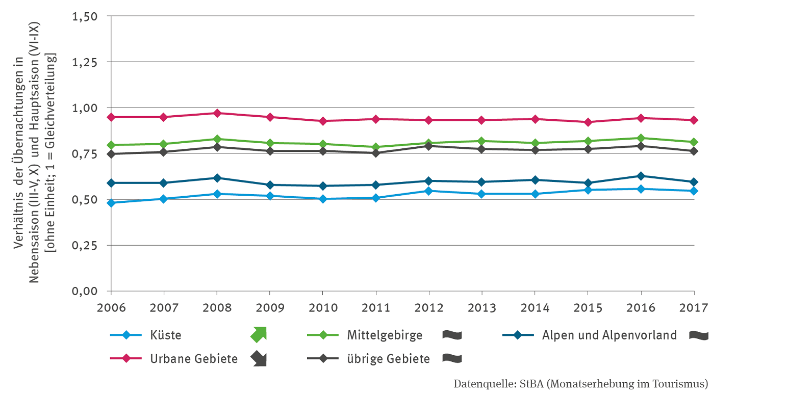 Das Linien-Diagramm bildet das Verhältnis der Übernachtungen in der Nebensaison (III-V, X) und in der Hauptsaison (VI-IX) ab. Der Wert 1 bedeutet eine Gleichverteilung. Die Darstellung ist differenziert für die Küste, die Mittelgebirge, die Alpen und das Alpenvorland, die urbanen Gebiete sowie übrige Gebiete. Die Zeitreihe reicht von 2006 bis 2017. Alle Linien verlaufen auf Werte unter 1. Die Linien schneiden sich nicht. Die niedrigsten Werte hat die Linie Küste (mit signifikant steigendem Trend), darüber folgt die Linie Alpen und Alpenvorland (ohne Trend), dann die Linie übrige Gebiete (ohne Trend), dann die Linien Mittelgebirge (ohne Trend), zuletzt die Linie urbane Gebiete (mit signifikant fallendem Trend). Keine der Lienen zeigt aber größere Bewegungen.