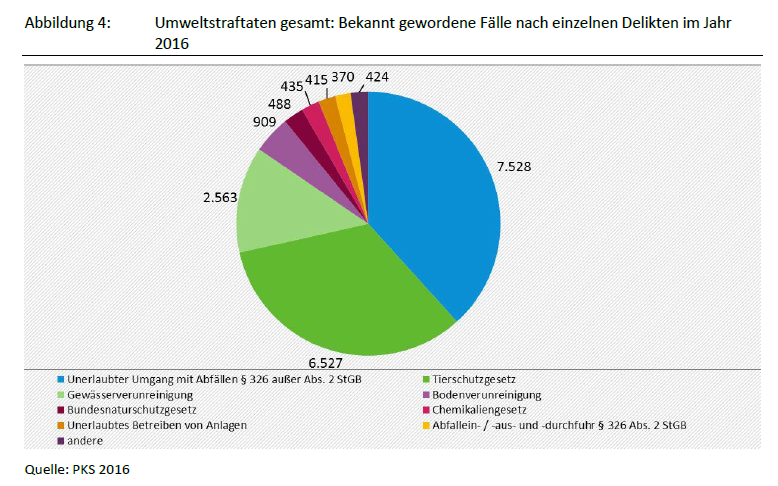 Das Tortendiagramm zeigt die 2016 bekannt gewordenen Fälle der gesamten Umweltstraftaten nach einzelnen Delikten. Im Jahr 2016 waren 7.528 Fälle, das heißt 38 Prozent aller Umweltstraftaten Straftaten des unerlaubten Umgangs mit Abfällen (§ 326 außer Absatz 2 StGB). Straftaten nach dem Tierschutzgesetz hatten mit 6.527 Fällen einen Anteil von 33 Prozent, Gewässerverunreinigungen mit 2.563 Fällen von 13 Prozent. Mit deutlich kleinen Fallzahlen folgten Bodenverunreinigungen, Straftaten nach dem Bundesnaturschutzgesetz, dem Chemikaliengesetz, das unerlaubte Betreiben von Anlagen und die illegale Abfallein-, -aus- und -durchfuhr nach § 326 Abs. 2 StGB.