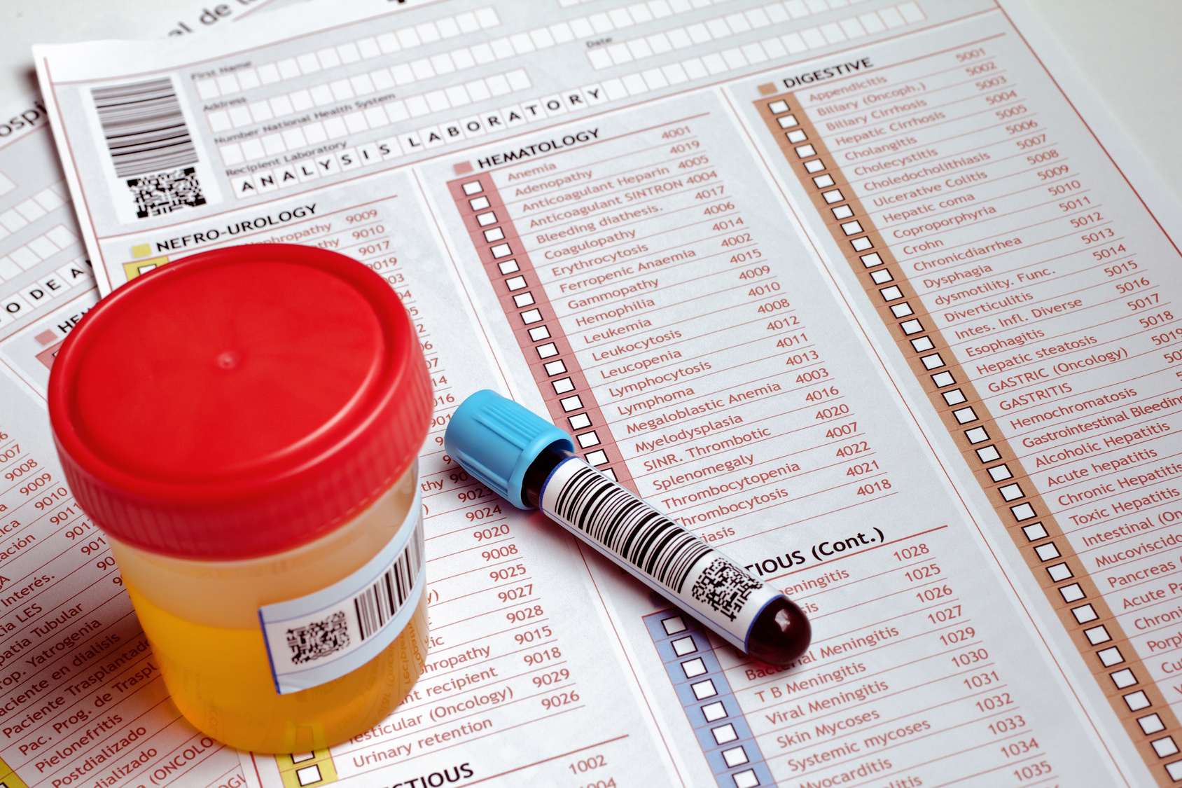 Urin- und Blutprobe mit Formular für die Laboruntersuchung