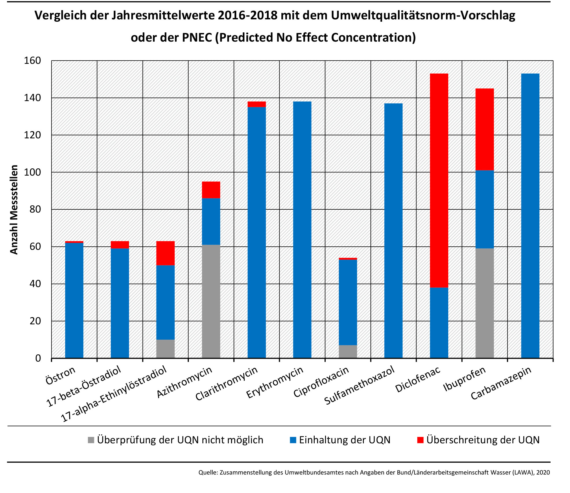 Vergleich der Jahresmittelwerte 2016 - 2018 mit dem Umweltqualitätsnorm Vorschlag oder der PNEC
