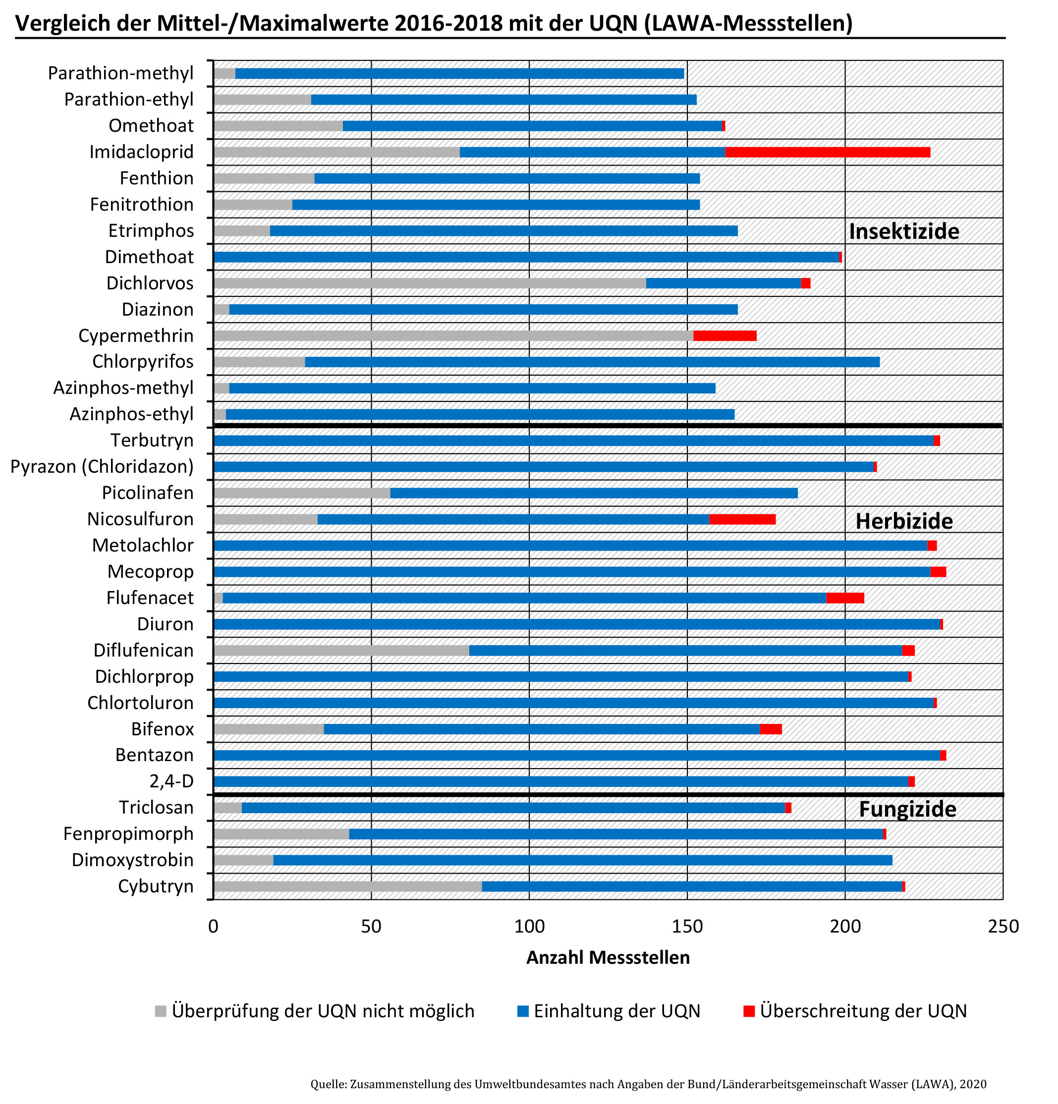 Vergleich der Mittel-/Maximalwerte 2016 - 2018 mit der UQN (LAWA-Messstellen)