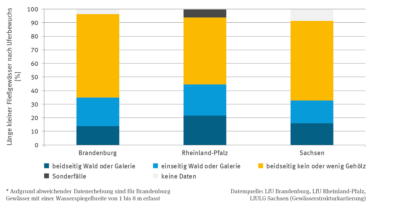 Die Stapelsäulen-Grafik zeigt zum aktuellen Zeitpunkt für die Länder Brandenburg, Rheinland-Pfalz und Sachsen den Prozentanteil der Uferbewuchs-Kategorien "beidseitig Wald oder Galerie", "einseitig Wald oder Galerie", "beidseitig kein oder wenig Gehölz", "Sonderfälle" und "keine Daten" an der Lauflänge kleiner Fließgewässer. Der Anteil der Kategorie "beidseitig Wald oder Galerie" ist mit etwas mehr als 20 Prozent von den drei Ländern in Rheinland-Pfalz am höchsten, in Brandenburg mit knapp 14 Prozent am geringsten. In Brandenburg gibt es an mehr als 61 Prozent der Lauflänge "beidseitig kein oder wenig Gehölz.