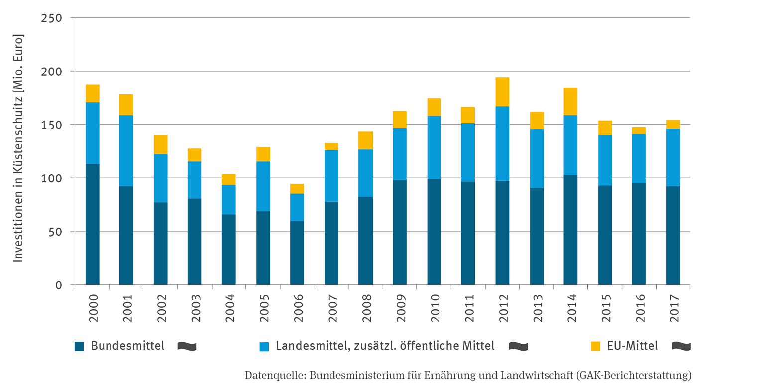 Die Stapelsäulen-Grafik zeigt die Investitionen in den Küstenschutz in Millionen Euro aus Bundesmitteln, Landesmitteln mit zusätzlichen öffentlichen Mitteln sowie EU-Mitteln in der Zeitreihe von 2000 bis 2017. Die Aufwendungen schwanken von Jahr zu Jahr, am höchsten waren sie 2012, am niedrigsten im Jahr 2006. Bei keiner der drei Kategorien zeigt sich ein Trend. In allen Jahren ist der Anteil der Bundesmittel am höchsten.
