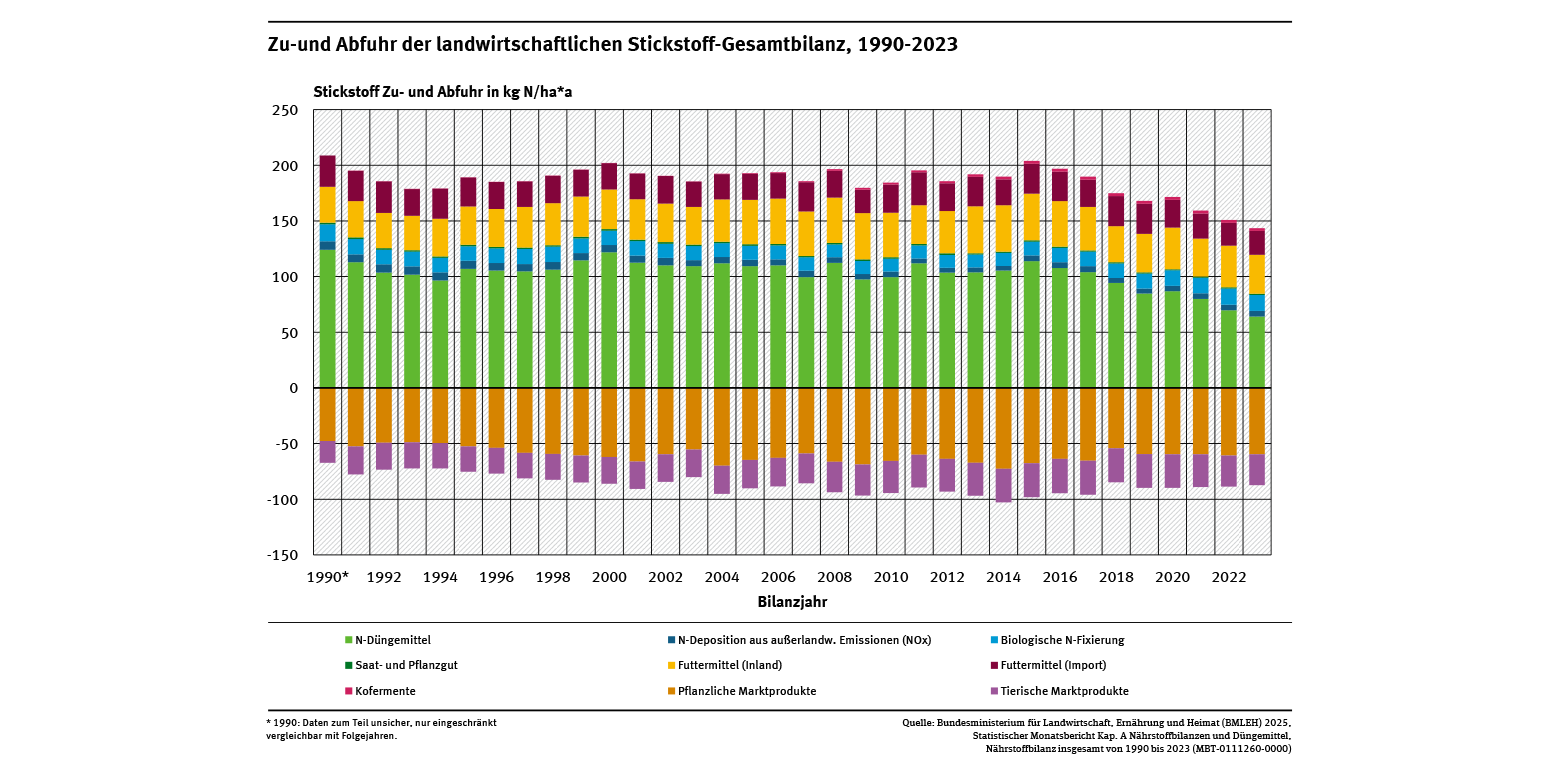 Zu-und Abfuhr der landwirtschaftlichen Stickstoff-Gesamtbilanz, 1990-2023
