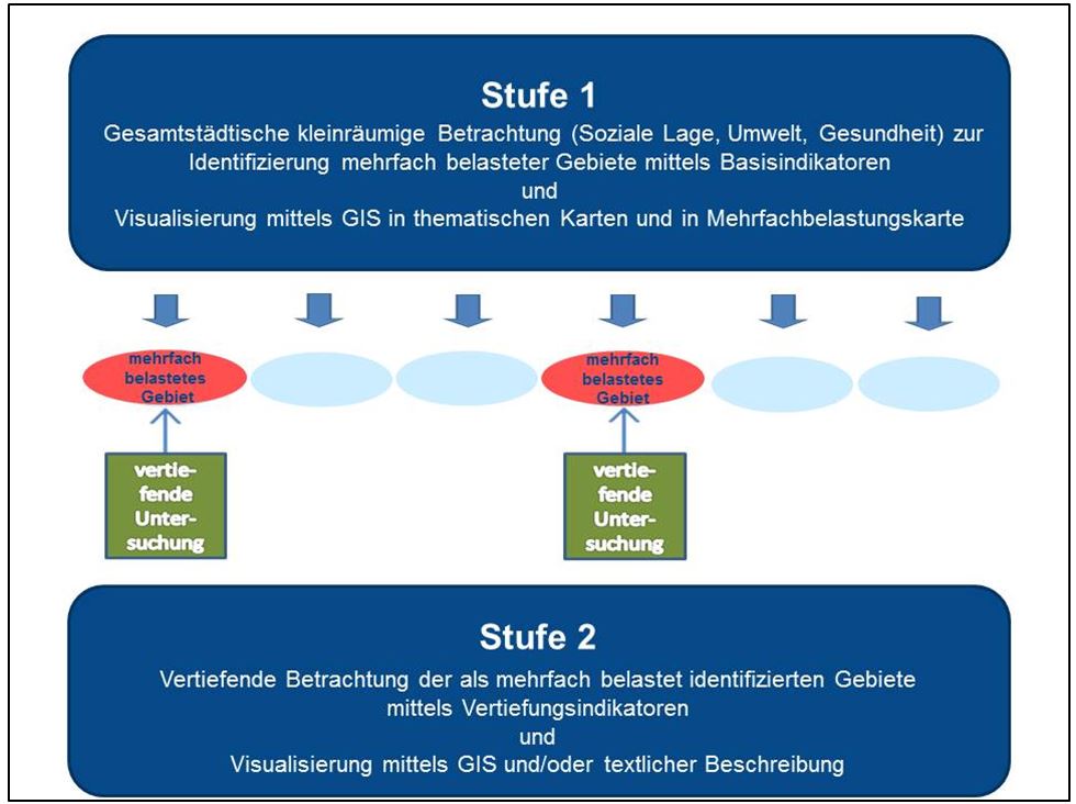 Grafische Darstellung des zweistufigen Verfahrens zur Identifizierung und Untersuchung mehrfach belasteter Gebiete des Forschungsprojekts "Umweltgerechtigkeit im städtischen Raum - Entwicklung von praxistauglichen Strategien und Maßnahmen zur Minderung sozial ungleich verteilter Umweltbelastungen", durchgeführt vom Deutschen Institut für Urbanistik (Difu) im Auftrag des UBA.