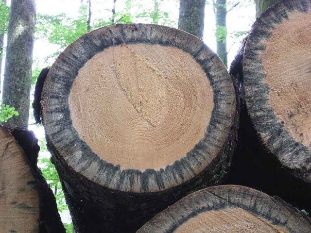 - Stammholzbläue oder primäre Bläue: Sie entsteht an frisch geschlagenem Holz und dringt von der sogenannten Hirn- oder Mantelfläche aus in stehende oder liegende Stämme ein.