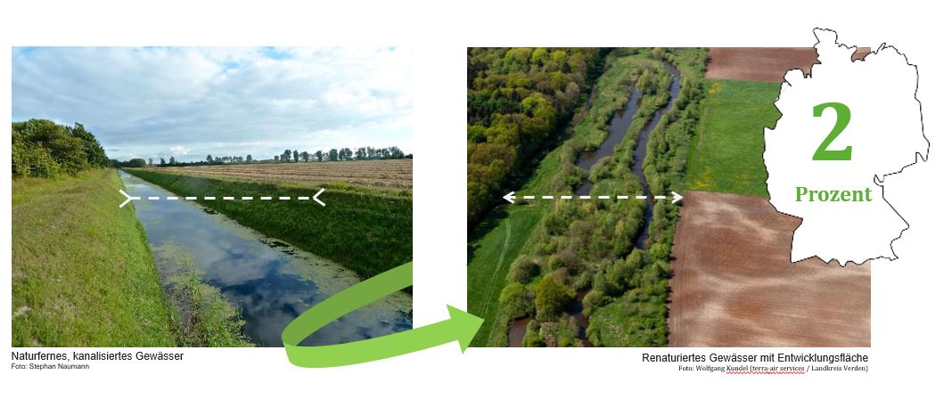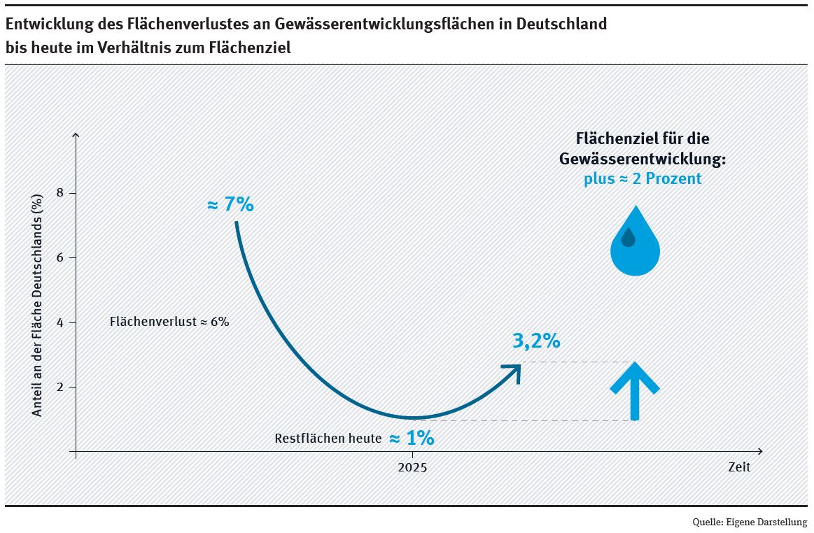 Ursprünglich dürften den Bächen und Flüssen etwa 7 Prozent der Fläche Deutschlands zur Verfügung gestanden haben. Diese Fläche wurde durch den Gewässerausbau und Eingriffe in Auen- und Gewässerflächen auf ca. 1 – 1,4 Prozent reduziert. Mit der Realisierung eines Flächenziels von 2 Prozent, würde den Fließgewässern daher der Entwicklungsraum zurückgegeben werden, den das Fließgewässer- und Auensystem im Minimum benötigt.