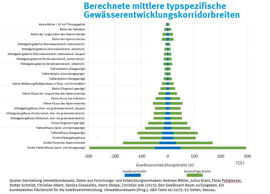 Die berechneten Gewässerentwicklungsbreiten, die benötigt werden, um einen guten ökologischen Zustand erreichen zu können, weisen eine große Spannweite auf. In der Gewässerentwicklungsbreite ist sowohl die eigentliche Breite des Gewässers als auch die Breite enthalten, die ein Gewässer aktiv zum Beispiel bei Hochwasser umgestaltet. Wenn ein Fluss also eine Gewässerentwicklungsbreite von 50 m aufweist und das Gewässer selbst 10 Meter breit ist, werden links und rechts des Flusses also jeweils 20 Meter Fläche benötigt.