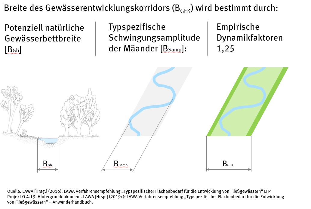 Bei der Berechnung der nötigen Gewässerentwicklungsfläche macht man sich Gesetzmäßigkeiten der natürlichen Flussentwicklung zu nutze. Ein Gewässerbett wird beispielsweise umso breiter, je mehr Wasser ein Bach oder Fluss normalerweise mit sich führt, je geringer das Gefälle ist und je mehr Widerstand dem fließenden Wasser entgegengebracht wird. Für die Berechnung der Gewässerbettbreite werden daher Informationen zum Talgefälle, Windungsgrad, Böschungsneigung, Sohlrauheit und Breiten-Tiefen-Verhältnis sowie zum mittleren bordvollen Abfluss benötigt. Diese Informationen liegen z.B. in Form von typspezifischen Gewässersteckbriefen vor.