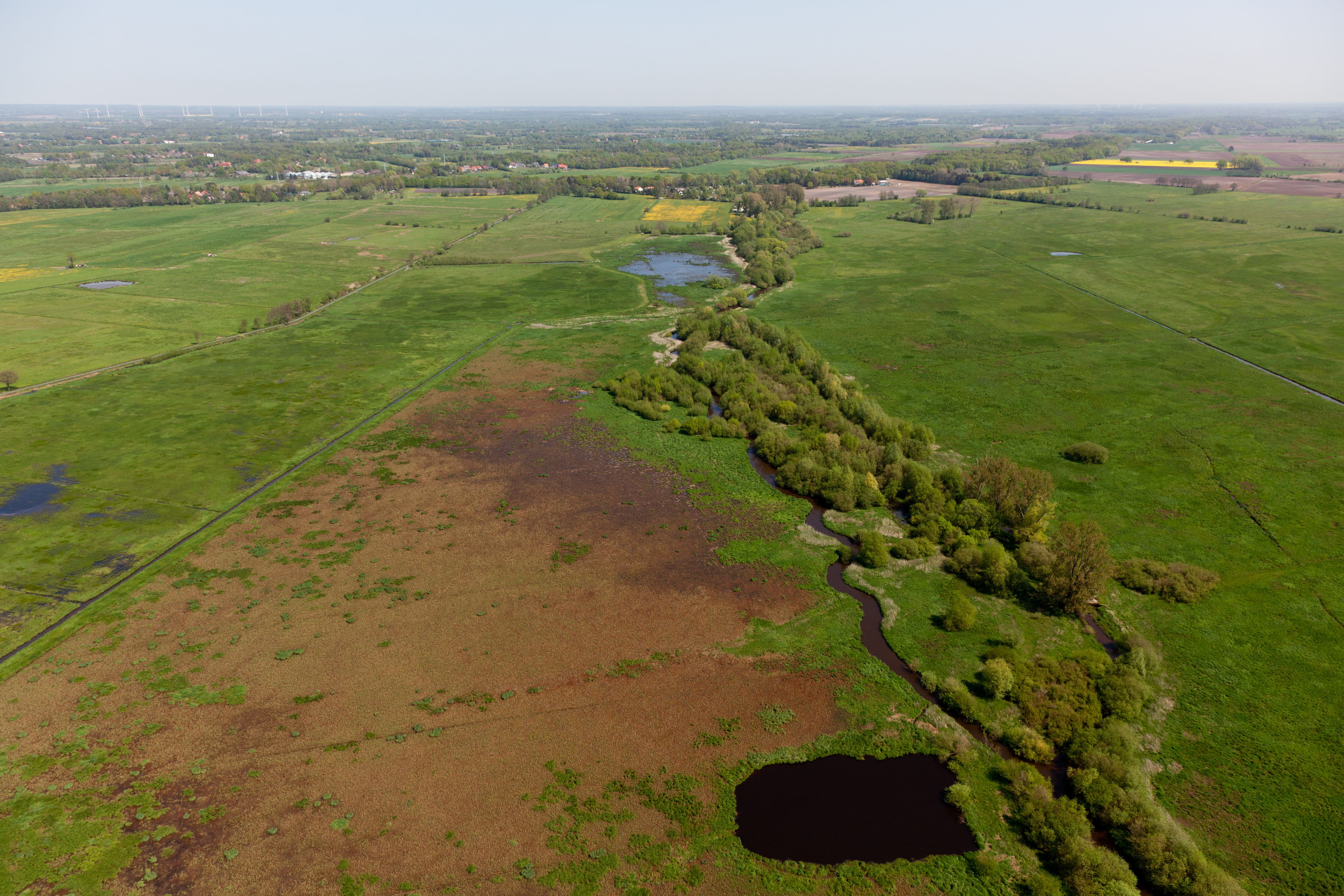 Luftbildaufnahme des sehr breiten Entwicklungskorridors mit Bäumen und Sträuchern, der den Fluss Wümme von landwirtschaftlichen Flächen und Grünland abgrenzt.