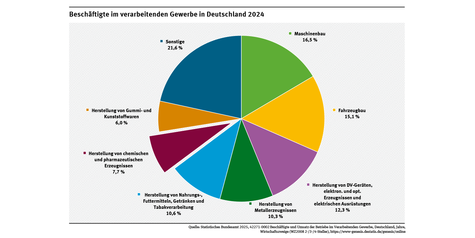 Unternehmen, die in Deutschland Chemikalien oder aus ihnen chemische Produkte wie Arzneimittel, Biozide, Pflanzenschutzmittel, Chemiefasern, Farben, Kitte, Wasch- und Reinigungsmittel, Körperpflegemittel, Duftstoffe oder Seifen herstellen, setzten im Jahr 2024 mit diesen Produkten mehr als 223 Milliarden (Mrd.) Euro um. In der Chemie- und Pharmaindustrie arbeiteten 2024 etwa 480.000 Menschen. Das sind fast 8 % der Erwerbstätigen im verarbeitenden Gewerbe und mehr als 1 % aller Erwerbstätigen insgesamt. Damit gehört der Wirtschaftszweig zu den wichtigsten Industriesektoren in Deutschland (siehe Abb. „Beschäftigte im verarbeitenden Gewerbe in Deutschland 2024“ und Abb. „Umsatz im verarbeitenden Gewerbe in Deutschland 2024“).