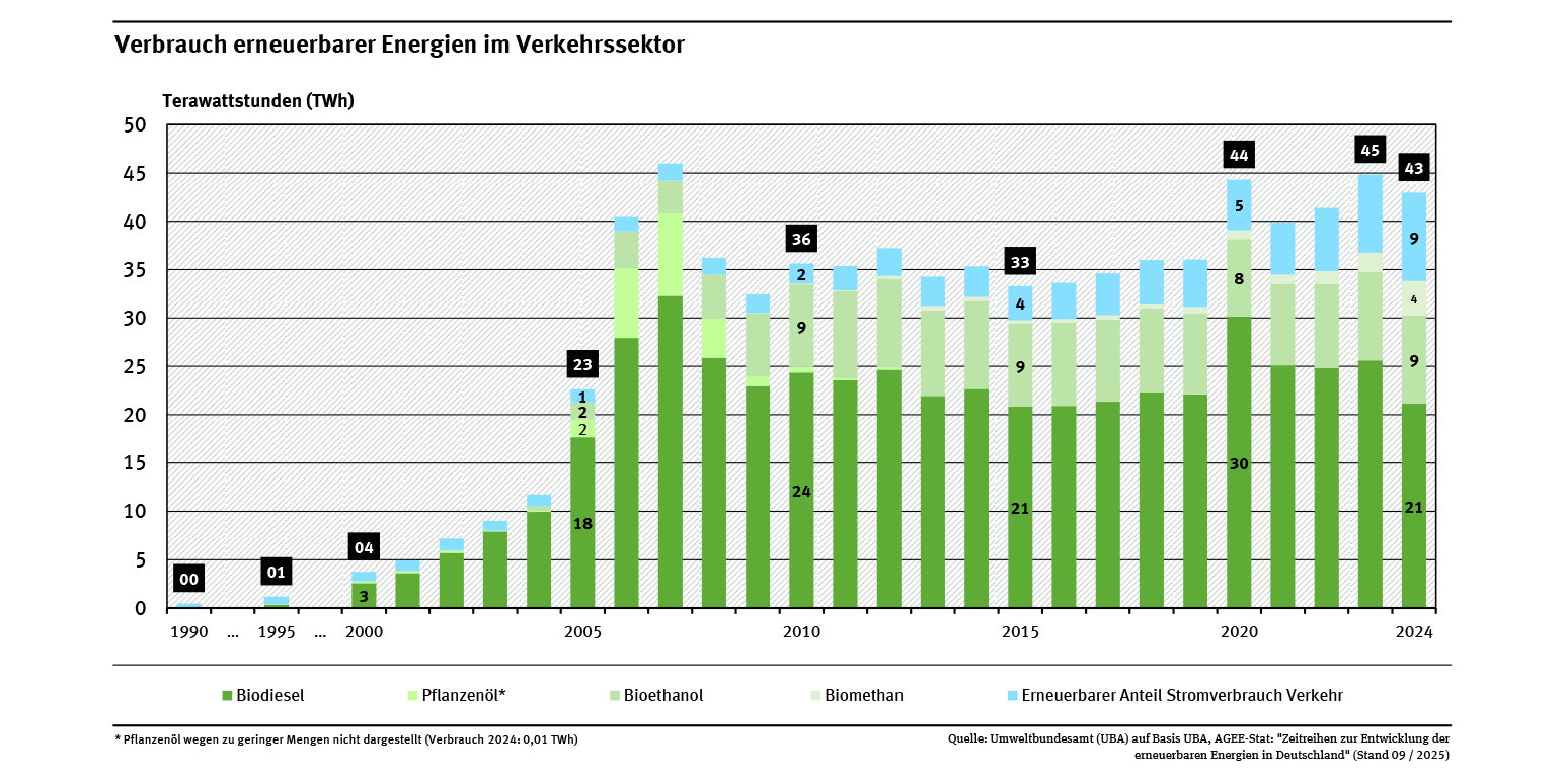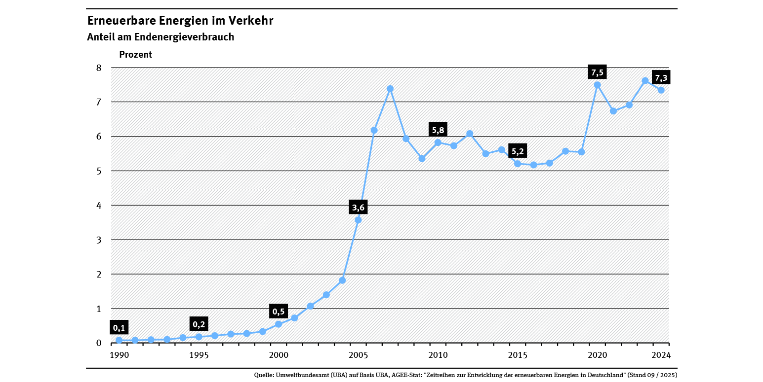 - Im Jahr 2024 liegt der Anteil der Erneuerbaren am Energieverbrauch im Verkehr bei 7,3 %. Wichtigster Treiber der Entwicklung der letzten Jahre war vor allem der erneuerbare Strom, dessen Verbrauch seit 2020 um 75 % anstieg, während gleichzeitig die Summe der eingesetzten Biokraftstoffe zurückging.