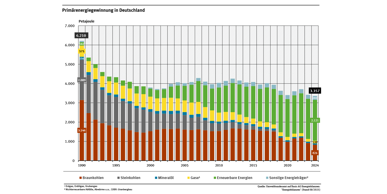 Seit dem Jahr 1990 ging die Gewinnung von konventionellen fossilen Energierohstoffen in Deutschland um mehr als drei Viertel zurück und konnte auch durch einen Zuwachs bei den erneuerbaren Energien nicht kompensiert werden. Im Jahr 2024 wurden etwa 3.350 Petajoule (PJ) inländisch gewonnen (siehe Abb. „Primärenergiegewinnung in Deutschland“). Das entspricht etwa 32 % des gesamten Primärenergieverbrauchs dieses Jahres. Der Anteil der inländischen Gewinnung am Primärenergieverbrauch schwankt seit Mitte der 2000er Jahre zwischen 28 und 32 %.
