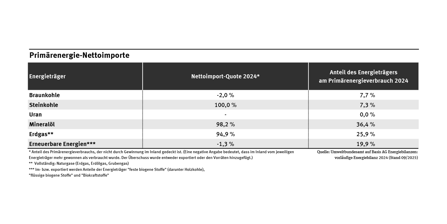 Neben den erneuerbaren Energien ist noch immer die Braunkohle der bedeutendste inländische Energieträger und machte im Jahr 2024 25 % der im Inland gewonnenen Primärenergie aus. Dabei wird seit dem Jahr 2003 in Deutschland regelmäßig etwas mehr Braunkohle gefördert, als im Inland verbraucht wird. Darüber hinaus stammten 2024 etwa 5 % des in Deutschland verbrauchten Erdgases und etwa 2 % des Inlandsverbrauchs an Mineralöl aus deutschen Quellen. Die Förderung von Steinkohle wurde in Deutschland 2019 eingestellt.