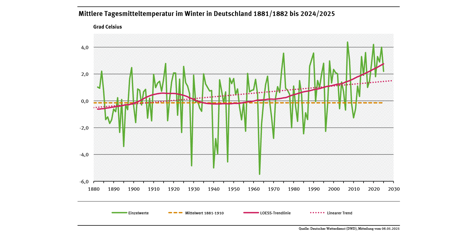 Der Winter 2023/24 (meteorologischer Winter: Dezember bis Februar) war sehr mild. Jeder der drei Wintermonate war wärmer als die vieljährigen Monatsmittel für den Referenzzeitraum 1961-1990. Der Monat Dezember erreichte eine Mitteltemperatur von 3,3 °C. Im Januar wurde eine Mitteltemperatur von 1,5 °C registriert und im Februar 6,6 °C. Damit ist der Februar 2024 der bisher wärmste Wintermonat und der Monat mit der höchsten Abweichung gegenüber dem vieljährigen Mittelwert (6,2 K gegenüber 1961-1990). Der Winter 2023/2024 war mit einer positiven Abweichung von ungefähr 3,8 °C vom historischen Temperaturmittel der Wintermonate 1961-1990 der bisher 3.-wärmste Winter seit 1881 (siehe Abb. „Mittlere Tagesmitteltemperatur im Winter in Deutschland“).