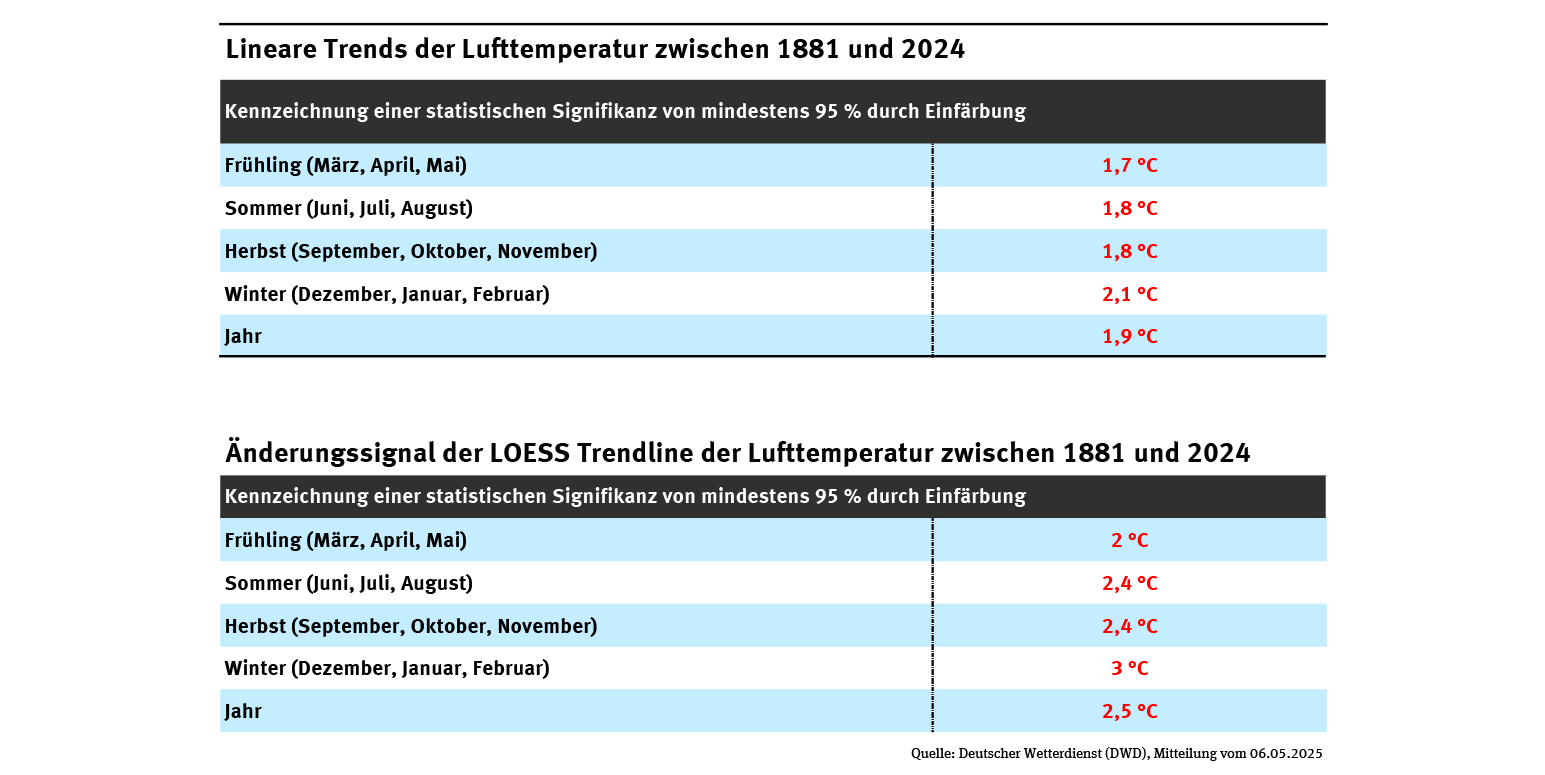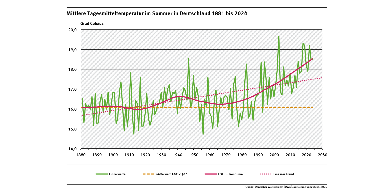 Der langfristige lineare Temperaturanstieg im Sommer entspricht für den Zeitraum 1881-2024 mit 1,8 °C in etwa dem jährlichen linearen Trend. Während der Temperaturanstieg für den deutschen Frühling bei 1,7 °C liegt, erreicht der Temperaturanstieg im Herbst 1,8 °C. Die Temperaturen im Winter sind um 2,1 °C gestiegen. Speziell die Sommer seit 1997 waren besonders warm. Der Sommer 2003 ist weiterhin der wärmste Sommer, dann folgen die Sommer 2018, 2019 und 2022. Der Sommer 1996 war der letzte Sommer, der etwas unterhalb des 30-jährigen Mittelwertes von 1961-1990 lag. Beim Herbst haben wir den 14. wärmeren Herbst in Folge und beim Winter den 13. wärmeren in Folge beobachtet (einschließlich Winter 2023/24).