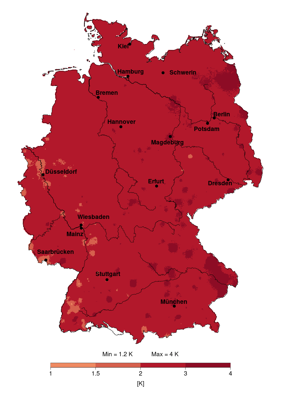 Im Jahr 2025 wurden durchschnittlich 11,1 Heiße Tage (Tage mit Tmax ≥ 30 °C) beobachtet. Besonders viele Heiße Tage gab es in 2018 (mit durchschnittlich 20,4 Heißen Tagen) sowie im Jahr 2022 (17,3), aber auch schon in 2015 (17,6) sowie 2003 (19,0).