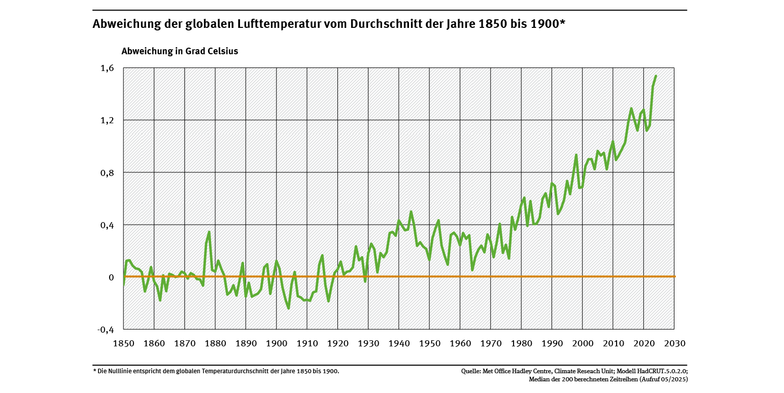 Ein Diagramm zeigt die Abweichung der weltweiten Lufttemperatur zwischen 1850 und 2024 vom Durchschnitt der globalen Lufttemperatur in der Referenzperiode von 1850 bis 1900. 2024 war 1,54 Grad Celsius wärmer als der Durchschnitt dieser Vergleichsperiode. Abweichung der globalen Lufttemperatur vom Durchschnitt der Jahre 1850 bis 1900