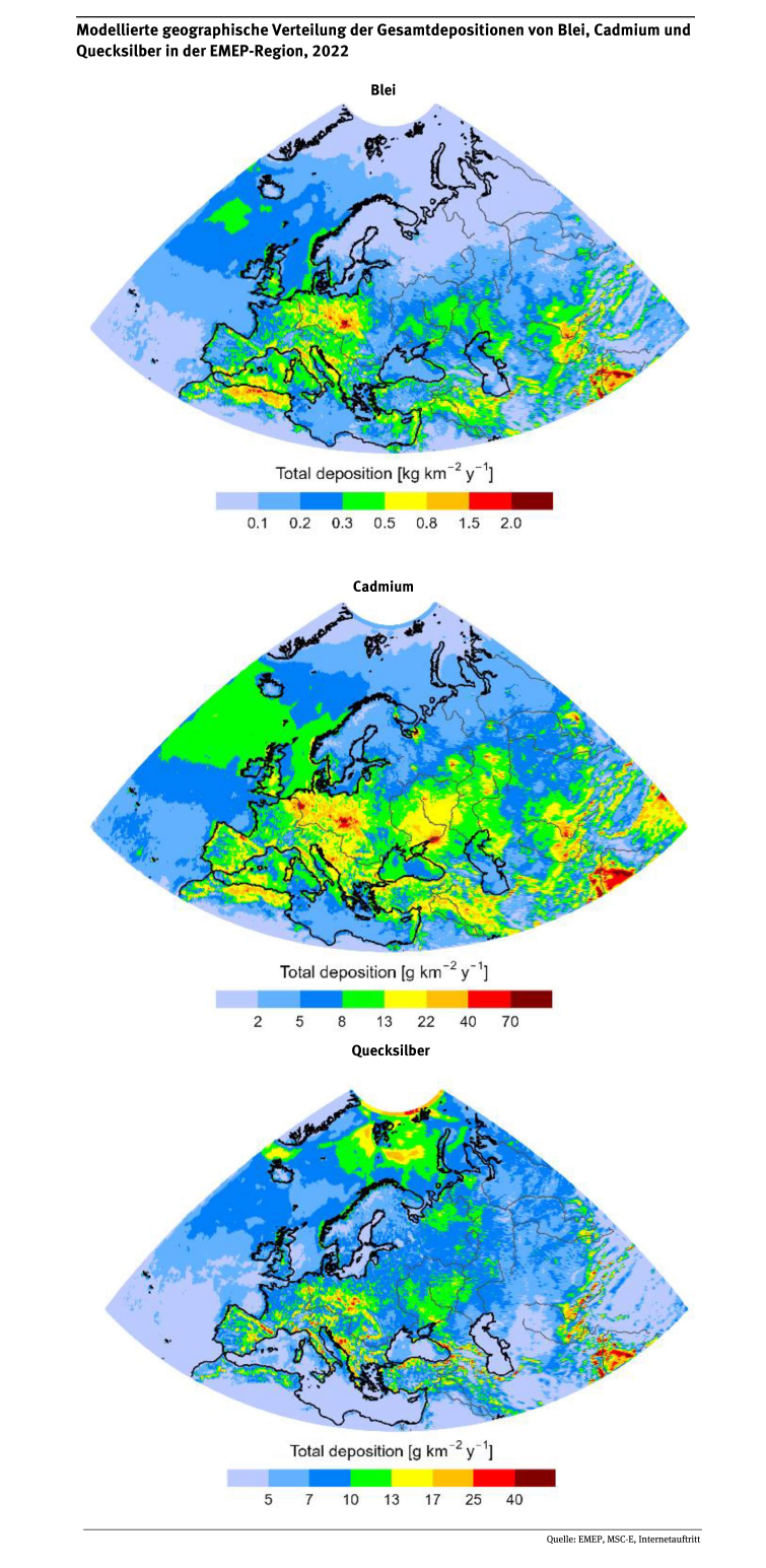 Im Rahmen des europäischen Überwachungsprogramms EMEP wird mittels atmosphärischer Chemie-Transportmodelle die gesamte Ablagerung (nasse und trockene Deposition) ausgewählter Schwermetalle flächendeckend für die EMEP-Region (Europa und Zentralasien) berechnet. Die Daten der Modellrechnungen werden in jährlichen Berichten durch das Meteorological Synthesizing Centre - East (MSC-E) veröffentlicht.