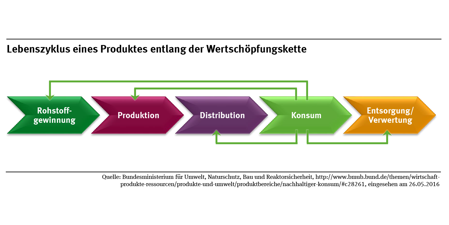 Schaubild: Lebenszyklus eines Produktes entlang der Wertschöpfungskette Quelle: BMUSchaubild als PDF