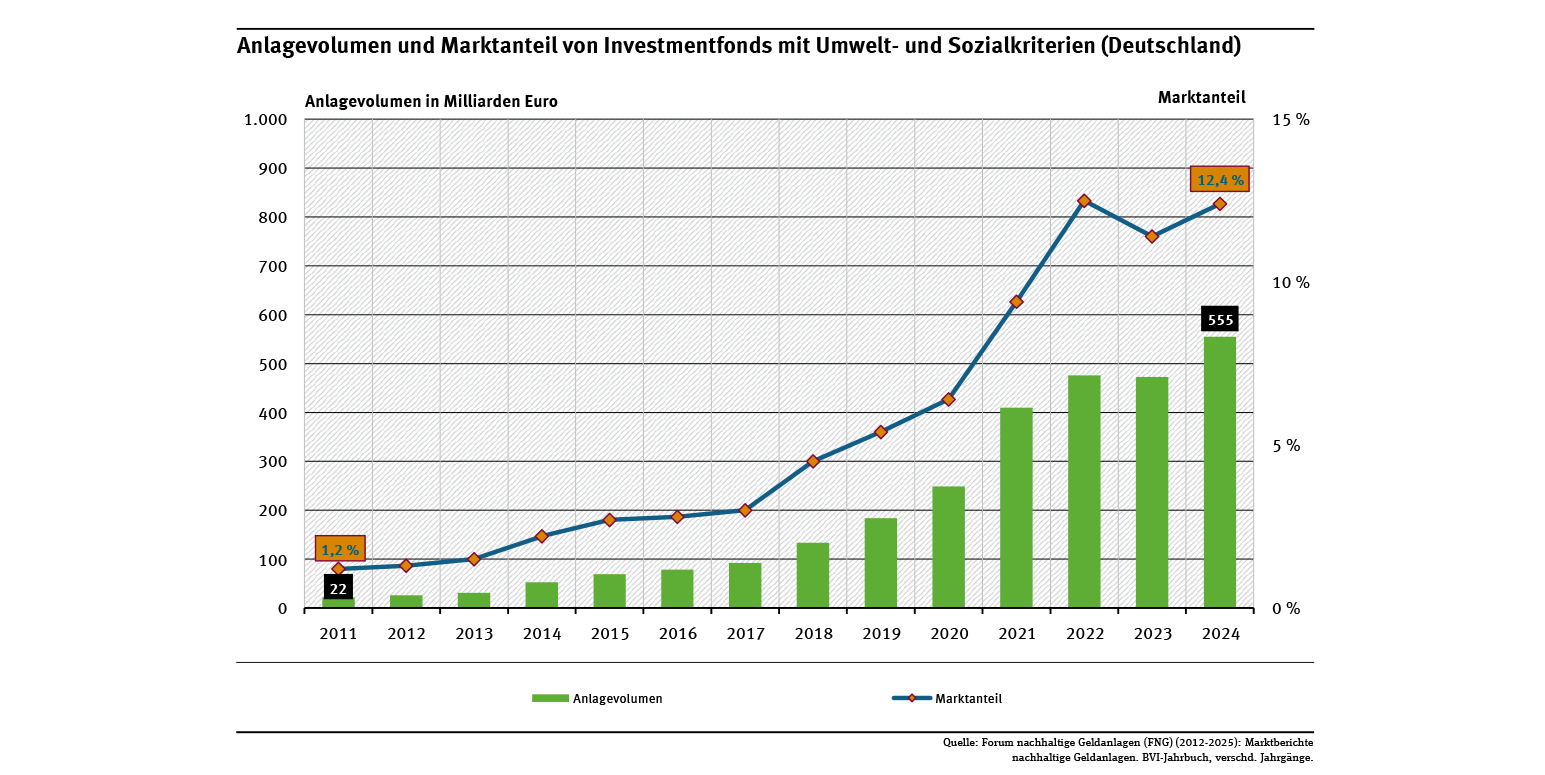 Das Anlagevolumen von nachhaltigen Investmentfonds hat sich in Deutschland von 2014 bis 2024 verzehnfacht. Es betrug rund 550 Milliarden Euro im Jahr 2024. Der Marktanteil betrug 12,4 % (siehe Abb. „Anlagevolumen und Marktanteil von Investmentfonds mit Umwelt- und Sozialkriterien“). Hinzu kommen 118 Milliarden Euro nachhaltig verwaltete Eigenanlagen und Kundeneinlagen von Spezialbanken mit Nachhaltigkeitsfokus. Nicht erfasst sind hier Investitionen in die energetische Sanierung von Eigenheimen oder in privat installierte Solaranlagen.