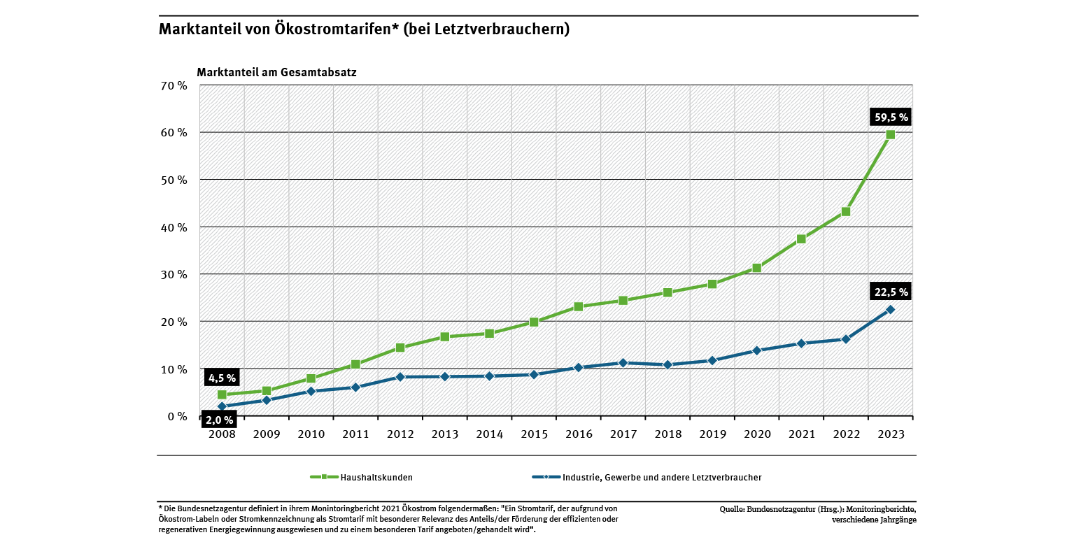 Der Marktanteil von Ökostromtarifen lag bei privaten Haushalten 2023 bei 59,5 %. Bei Industrie, Gewerbe und sonstigen Letztverbrauchern lag der Marktanteil bei 22,5 % (siehe Abb. „Marktanteil von Ökostromtarifen“).