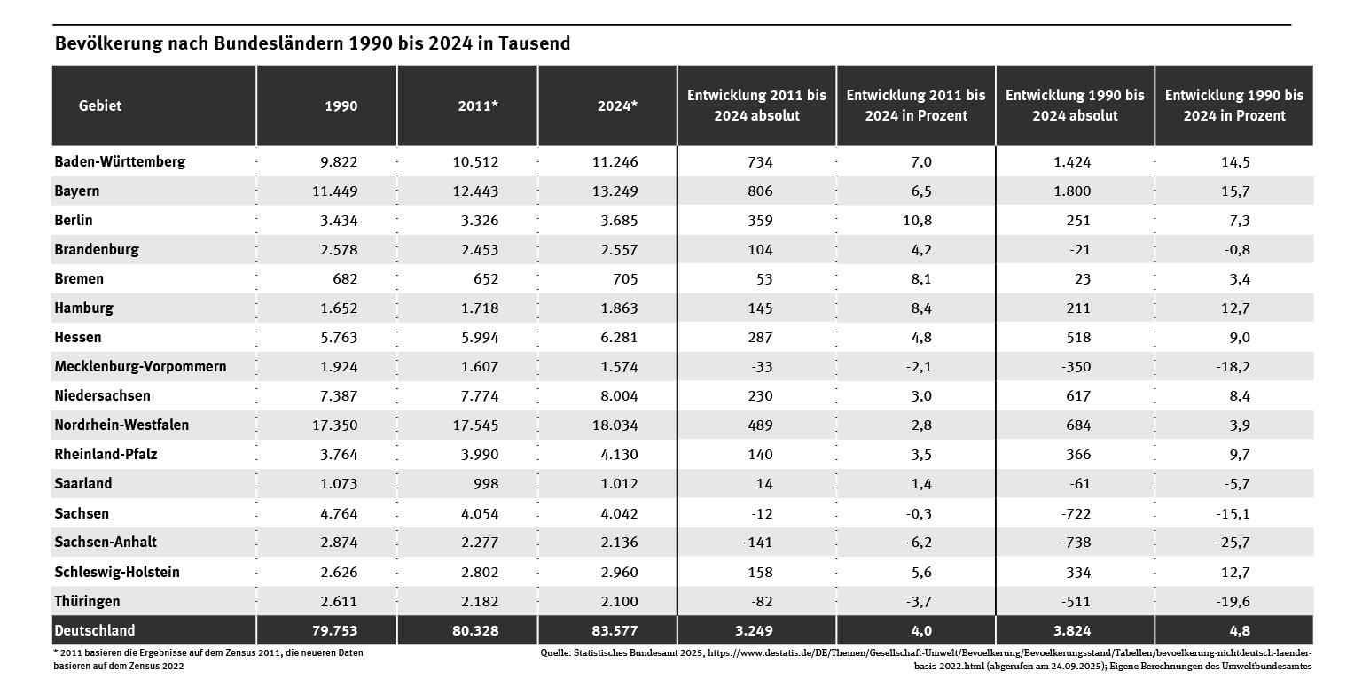 Von 1990 bis 2024 nahm die Bevölkerung in zehn Bundesländern zu und in sechs Bundesländern ab. Von 2011 bis 2024 sind es noch vier Bundesländern mit sinkender Bevölkerung (siehe Tab. „Bevölkerung nach Bundesländern 1990 bis 2024“).