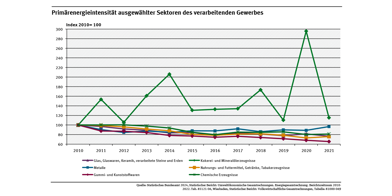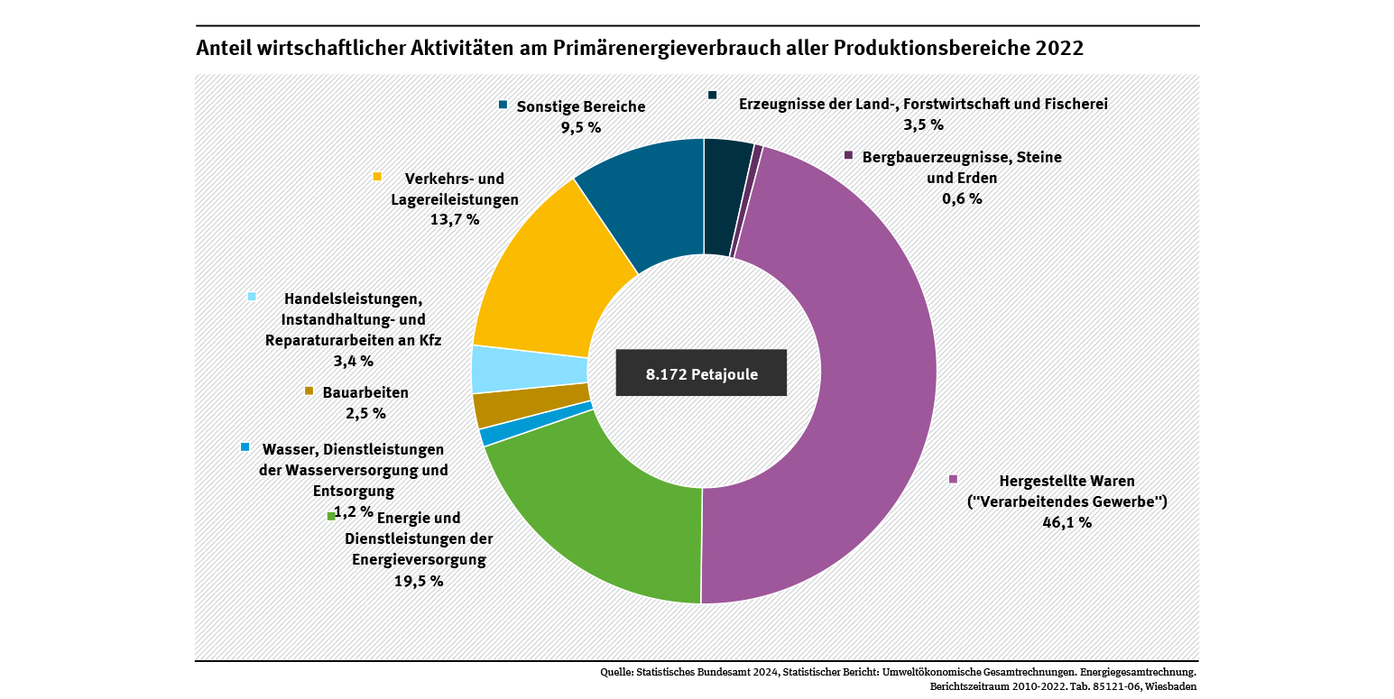 Der gesamte Primärenergiebedarf Deutschlands betrug im Jahr 2022 nach dem Inländerkonzept rund 11.854 Petajoule (PJ). Dabei wird der Verbrauch inländischer Wirtschaftseinheiten in der übrigen Welt in die Berechnung des Gesamtverbrauchs einbezogen, während der Verbrauch gebietsfremder Einheiten im Inland unberücksichtigt bleibt. Die privaten Haushalte in Deutschland verbrauchten rund 30 % der Primärenergie. Die Wirtschaft mit ihren vielen Produktionsbereichen benötigte die übrigen 70 %. Zu diesen Bereichen zählen das Herstellen von Waren, das Versorgen mit Energie und der Warentransport. All diese Produktionsbereiche verbrauchten im Jahr 2022 zusammen mehr als 8.170 PJ Primärenergie (siehe Abb. „Primärenergieverbrauch 2022 (Inländerkonzept)“).