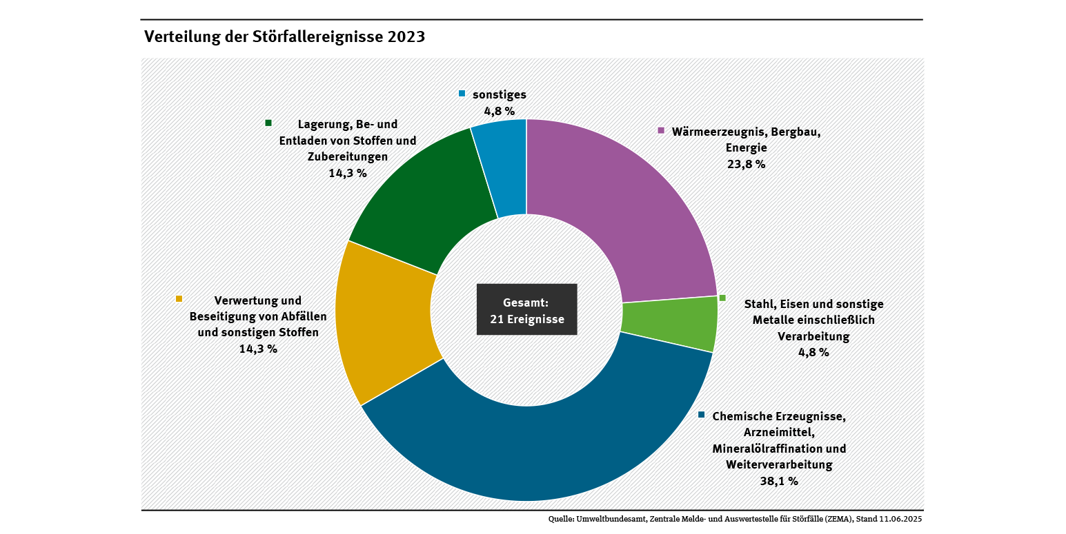 Acht dieser Ereignisse traten im Jahr 2023 bei der Herstellung von Chemikalien und der Raffination von Erdöl auf, drei Ereignisse im Bereich der Verwertung und Beseitigung von Abfällen, ein im Bereich Stahl, Eisen und sonstige Metalle einschließlich Verarbeitung, drei im Bereich Lagerung, Be- und Entladen von Stoffen und Zubereitungen, fünf im Bereich Wärmeerzeugnis, Bergbau, Energie und ein im Bereich Sonstiges (siehe Abb. „Verteilung der Störfallereignisse 2023“).