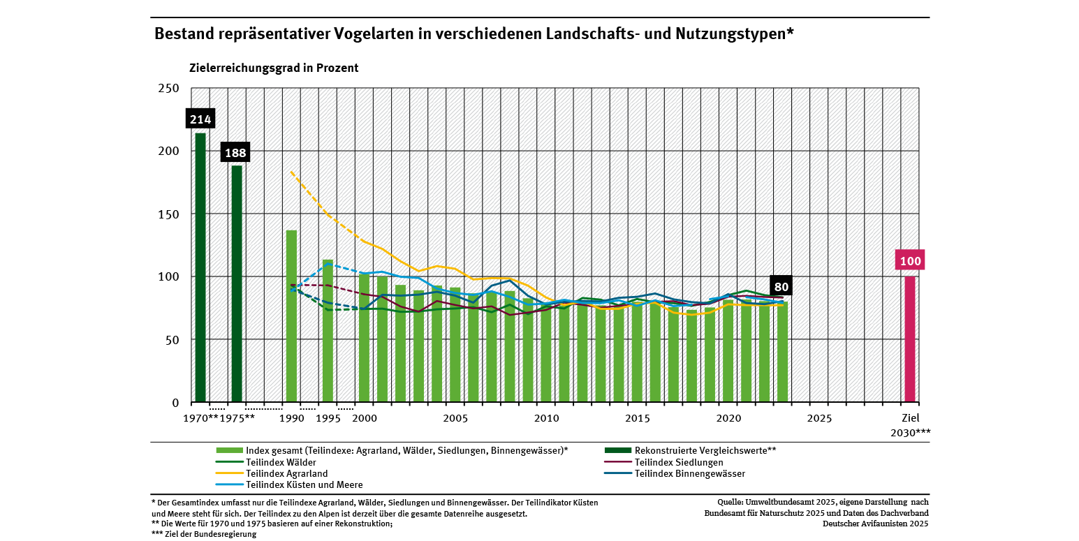 Der Indikator gibt die Entwicklung der Bestände ausgewählter Vogelarten für die wichtigsten Landschafts- und Nutzungstypen Deutschlands wieder. Der im Jahr 2004 entwickelte Indikator wurde in einem Forschungsvorhaben in den Jahren 2019 - 2022 überprüft und angepasst. Für jede Vogelart legte ein Expertengremium einen Bestands-Zielwert für das Jahr 2030 fest, der erreicht werden kann, wenn Naturschutz-Regelungen und Leitlinien der nachhaltigen Entwicklung zügig umgesetzt werden. Die artspezifischen Zielwerte wurden so normiert, dass sich für das Jahr 2030 ein Zielwert von 100 Prozent ergibt. Eine ausführliche Beschreibung der Methode findet sich in Achtziger et al. 2004. Die Überarbeitung des Indikators wird in Dröschmeister et al. 2025 dargestellt.