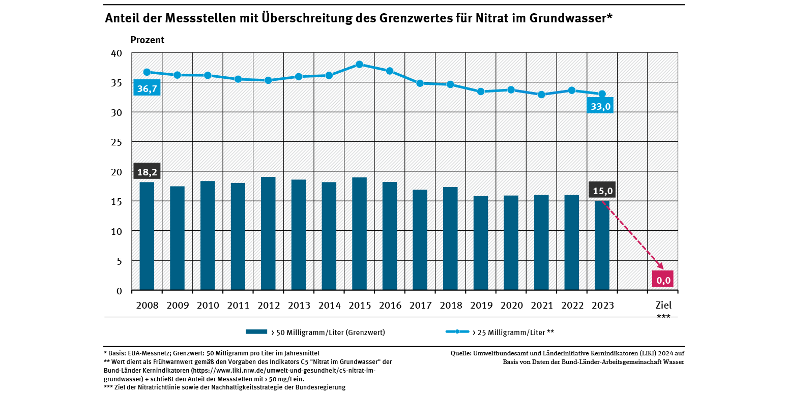 Die europäische Nitratrichtlinie (EU-RL 91/676/ EWG) hat das Ziel, Verunreinigungen des Grundwassers durch landwirtschaftliche Nitrateinträge zu vermeiden. Regierungen müssen Aktionsprogramme entwickeln, um Nitratgehalte über 50 mg/l zu verhindern. Seit 2008 liegt der Anteil der Messstellen, die den Grenzwert überschreiten, zwischen 15 und 19 %. Auch der Anteil der Messstellen mit einem erhöhten Nitrat-Gehalt über 25 mg/l stagniert seit 2008 bei etwa 33–38 %. Seit 2016 ist die Einhaltung des Nitrat-Grenzwertes auch Ziel der Nachhaltigkeitsstrategie der Bundesregierung (BReg 2016).