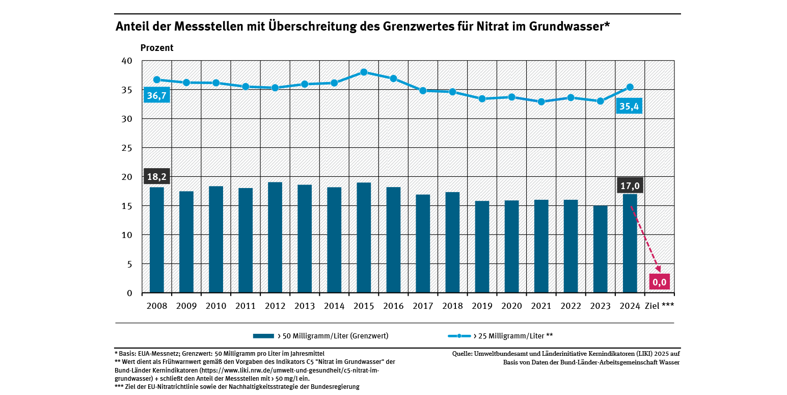 Die europäische Nitratrichtlinie (EU-RL 91/676/ EWG) hat das Ziel, Verunreinigungen des Grundwassers durch landwirtschaftliche Nitrateinträge zu vermeiden. Regierungen müssen Aktionsprogramme entwickeln, um Nitratgehalte über 50 mg/l zu verhindern. Seit 2008 liegt der Anteil der Messstellen, die den Grenzwert überschreiten, zwischen 15 und 19 %. Auch der Anteil der Messstellen mit einem erhöhten Nitrat-Gehalt über 25 mg/l stagniert seit 2008 bei etwa 33–38 %. Seit 2016 ist die Einhaltung des Nitrat-Grenzwertes auch Ziel der Nachhaltigkeitsstrategie der Bundesregierung (BReg 2016).
