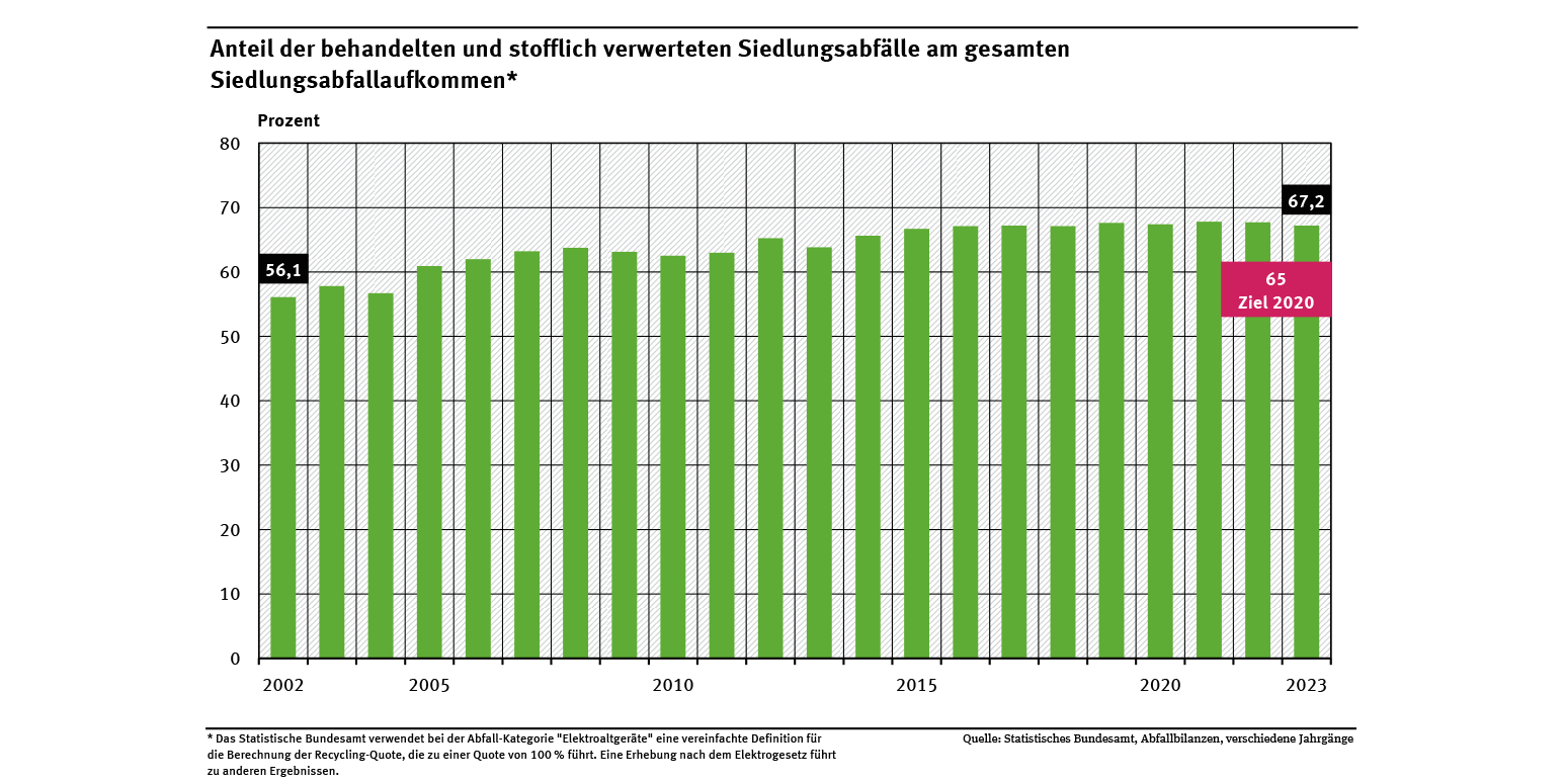 Wertstoffe werden verstärkt getrennt erfasst und überwiegend stofflich verwertet, also recycelt. Dies gilt insbesondere für Altpapier, Altglas, Verpackungen und Bioabfall. Das schont Rohstoffe, vermindert den Einsatz von Primärenergie und spart somit auch Kohlendioxid-Emissionen. Früher war es üblich, Siedlungsabfälle ohne weitere Behandlung zu deponieren. Dies ist seit 2005 nicht mehr erlaubt. Als Resultat sind die Methan-Emissionen aus Mülldeponien deutlich zurückgegangen.