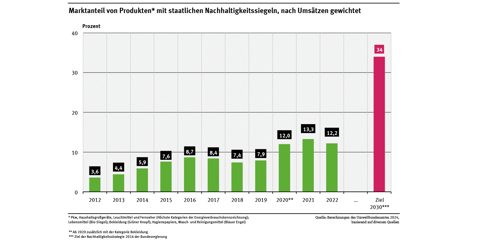 In ihrer Nachhaltigkeitsstrategie setzt sich die Bundesregierung Ziele für den Marktanteil umweltfreundlicher Produkte: Dieser soll bis 2030 auf 34 % steigen. Dieses Ziel erfordert vor allem, dass der Absatz von Biolebensmitteln, von umwelt- und sozialverträglicher Bekleidung sowie der Marktanteil von E-Autos deutlich steigen muss. Auch sollte die sich abschwächende Wachstumsdynamik bei energieeffizienten Produkten neu belebt werden.