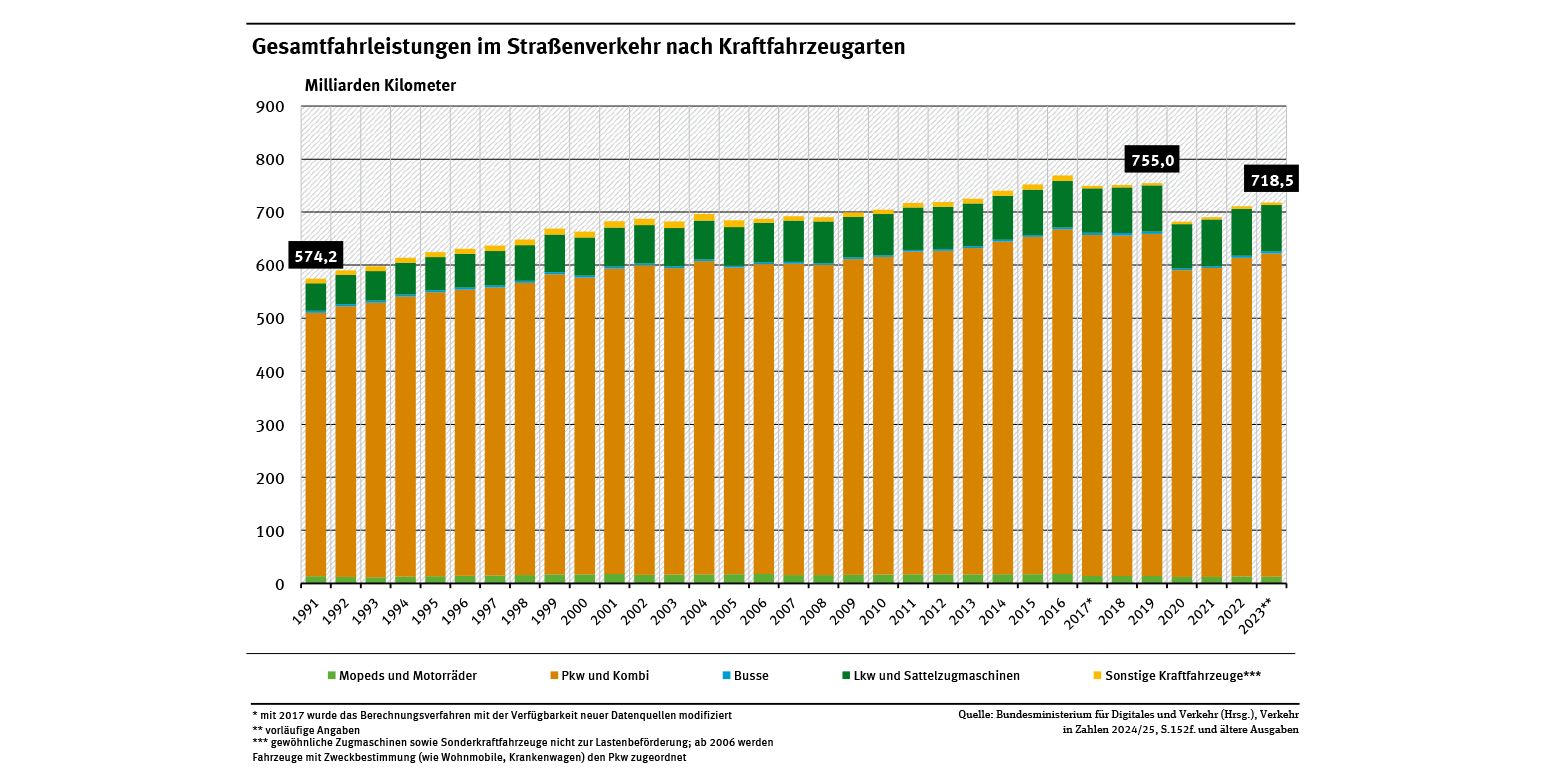 Die Fahrleistung aller Kraftfahrzeuge im Straßenverkehr stieg in Deutschland von 1991 bis 2019 um ca. 31,5 %. Die Fahrleistung des Personenverkehrs nahm in diesem Zeitraum um 29 % zu, die des Güterverkehrs um 69 %. Der sprunghafte Anstieg der Fahrleistung der Lkw ist für die Umwelt besonders problematisch, da diese pro gefahrenen Kilometer deutlich höhere Luftschadstoff- und Lärmemissionen als Pkw verursachen (siehe Abb. „Gesamtfahrleistungen im Straßenverkehr nach Kraftfahrzeugarten“). Ab dem Pandemiejahr 2020 zeichnet sich ein leicht verändertes Bild ab: Die Fahrleistung aller Kraftfahrzeuge im Straßenverkehr sank um 9,5 % gegenüber dem Vorjahr, sie blieb auch 2021 auf einem ähnlichen Niveau. Ab 2022 stieg sie wieder an, lag aber 2023 immer noch 4,8 % unterhalb des Niveaus von 2019.