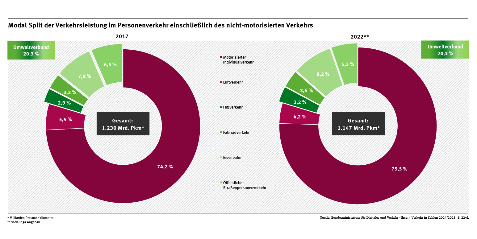 Die Verkehrsleistung im Personenverkehr erhöhte sich zwischen den Jahren 1991 und 2019 um fast 34 %, sank im Jahr 2020 um 21,2 % zum Vorjahr und stieg ab 2021 wieder an. In 2023 lag sie noch um 5,5 % unterhalb des Niveaus von 2019. Der motorisierte Individualverkehr mit Pkw und Krafträdern nahm bis 2019 um etwa 28,6 % zu, sank 2020 um 12,9 % und stieg in den folgenden drei Jahren um 3 bis 5 % im Vergleich zum Vorjahr an. Der Verkehr mit Pkw und Krafträdern behielt seine dominierende Stellung: Sein Anteil (Modal Split) an der gesamten Personenverkehrsleistung ging von 1991 (81,6 %) bis 2019 (78,4 %) kaum zurück und stieg pandemiebedingt in 2020 und 2021 sogar auf den Höchstwert von jeweils rund 87 %. Im Jahr 2023 sank der Anteil wieder auf 79,4 % (siehe Abb. „Personenverkehr: motorisierte Verkehrsleistung nach Verkehrsmitteln in Deutschland“).