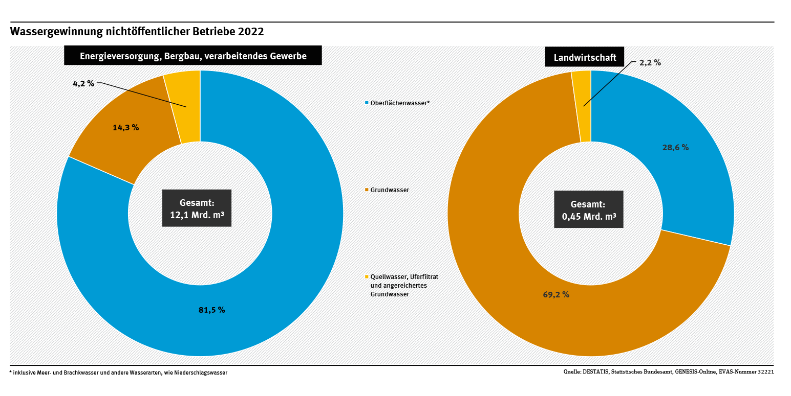Im Jahr 2022 entnahmen Energieversorgung, Bergbau und verarbeitendes Gewerbe sowie die Landwirtschaft insgesamt eine Wassermenge von etwa 12,5 Milliarden Kubikmeter (Mrd. m³), im Wesentlichen über eigene Gewinnungsanlagen aus Oberflächengewässern oder Grundwasser. Die Wasserentnahmen in Deutschland für die Energieversorgung, Bergbau und verarbeitendes Gewerbe waren 2022 weiterhin rückläufig. Seit dem Jahr 1991 sanken die Wasserentnahmen für Energie, Bergbau und verarbeitendes Gewerbe über eigene Gewinnungsanlagen von 41,3 Mrd. m³ auf 12,1 Mrd. m³.