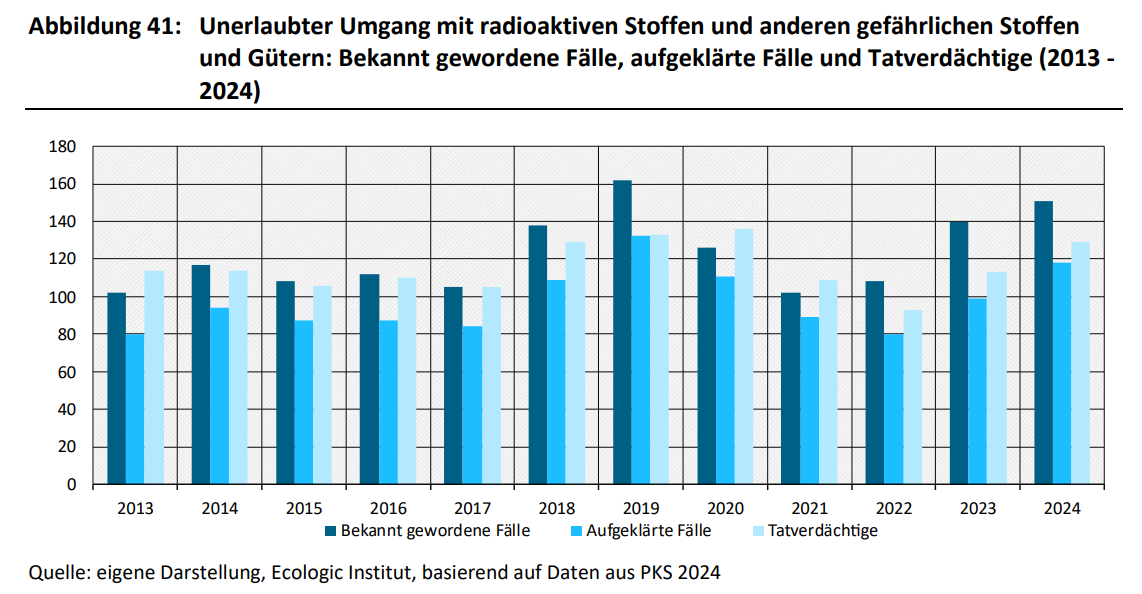 Dies ist ein Balkendiagramm. Zwischen 2013 und 2017 lag die Zahl der bekannt gewordenen Fälle des unerlaubten Umgangs mit radioaktiven Stoffen und anderen gefährlichen Stoffen und Gütern relativ konstant bei ca. 100 bis 120 Fällen pro Jahr. In den Jahren 2019 (162 Fälle) und 2024 (151 Fälle) lagen die Zahlen deutlich darüber. Die Aufklärungsquote in den Jahren 2013 bis 2024 lag mit kleinen Schwankungen zwischen knapp 70 % und 88 %. Im Jahr 2024 wurde eine Aufklärungsquote von 78 % erreicht.