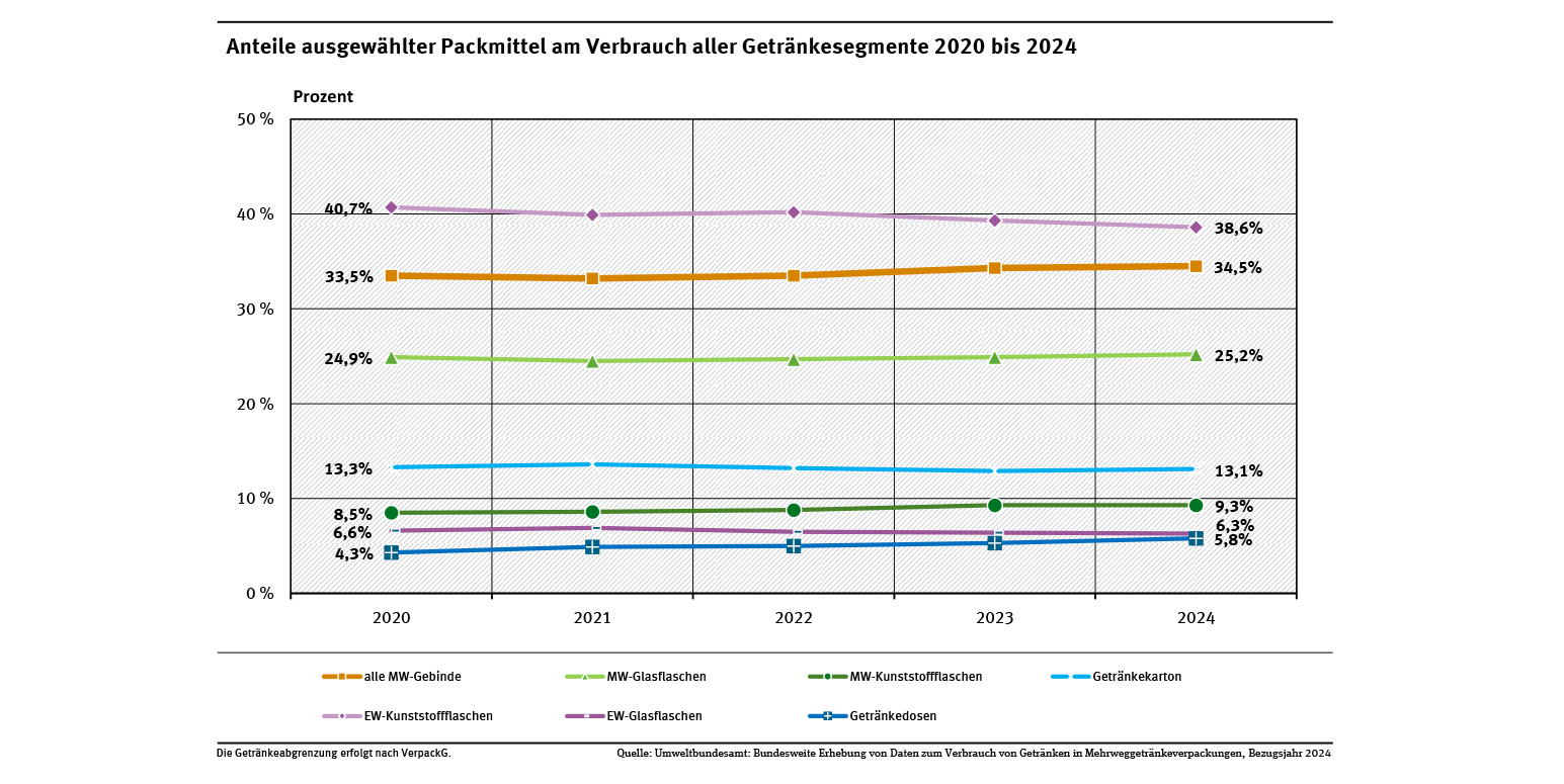 Anteile ausgewählter Packmittel am Verbrauch aller Getränkesegmente 2020 bis 2024