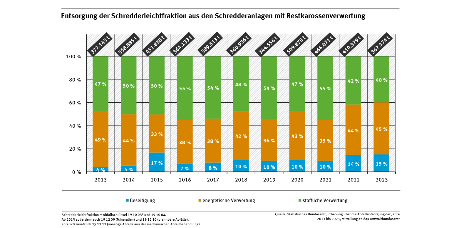 Diagramm: In den Schredderanlagen fallen jährlich rund 350.000 bis 500.000 t Schredderleichtfraktion an. Es werden etwa 10 Prozent beseitigt, etwa 40 % energetisch verwertet und etwa 50 % stofflich verwertet.