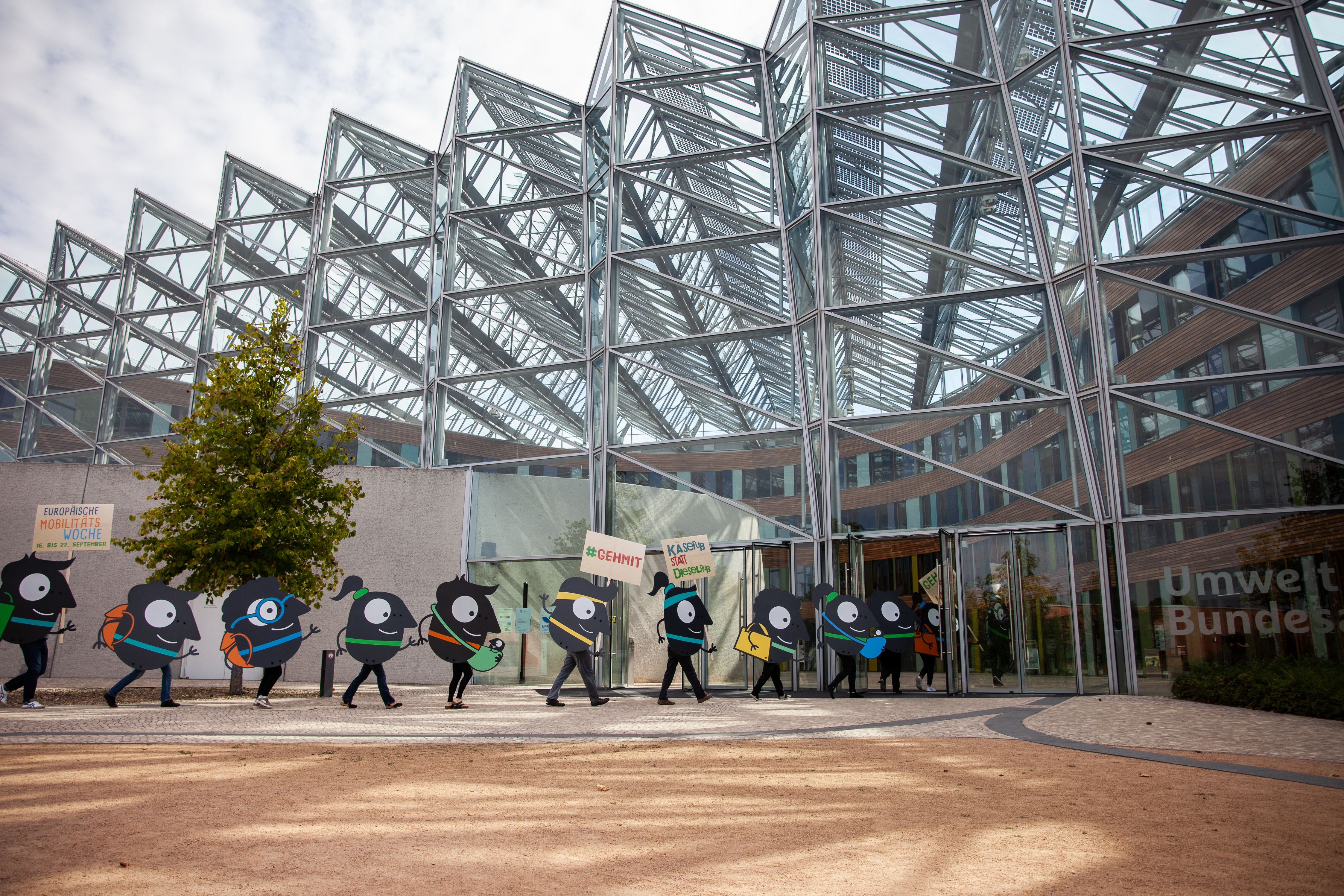 Für die Parade erhalten die zweidimensionalen Maskottchen unsere Beine, um so durch die dreidimensionale Welt zu spazieren. Mit einer entsprechenden Zahl an Freiwilligen lässt sich so eine kleine Parade in der Kommune realisieren. Zusätzlich können Plakate oder Banner erstellt werden, die an den Maskottchen mit Klebeband befestigt werden. Weitere Inspirationen liefert das UBA-Video „Edgar on Tour“.