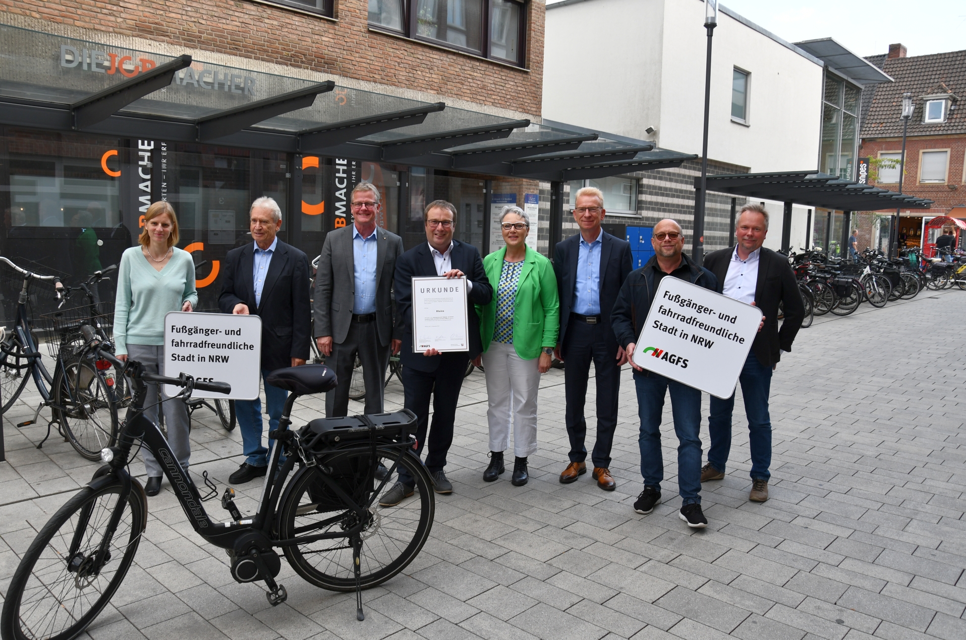 • Aufgrund des engagierten Einsatzes für bessere Verkehrsbedingungen von Fußgänger*innen und Radfahrenden wurde die Stadt Rheine im Rahmen der EMW als fußgänger- und fahrradfreundliche Stadt in NRW ausgezeichnet. Damit ist Rheine auch Mitglied der „Arbeitsgemeinschaft fußgänger- und fahrradfreundlicher Städte, Gemeinden und Kreise in NRW e.V.“ (AGFS NRW). Gemeinsam überreichten NRW-Verkehrsminister Oliver Krischer und AGFS-Vorstand Christine Fuchs am 09.2022 die Urkunde an Bürgermeister Dr. Peter Lüttmann.
