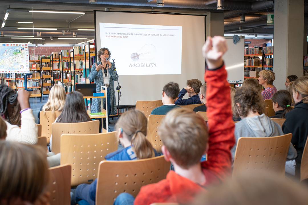 • Die Stadt Hürth bezog die Stadtbücherei aktiv in die EMW 2022 ein und stellte nicht nur passende Literatur auf einem Medientisch bereit, sondern weckte auch mit Lesung und Workshop das Interesse bei Kindern aus zwei sechsten Klassen für das Thema Klima und Mobilität.