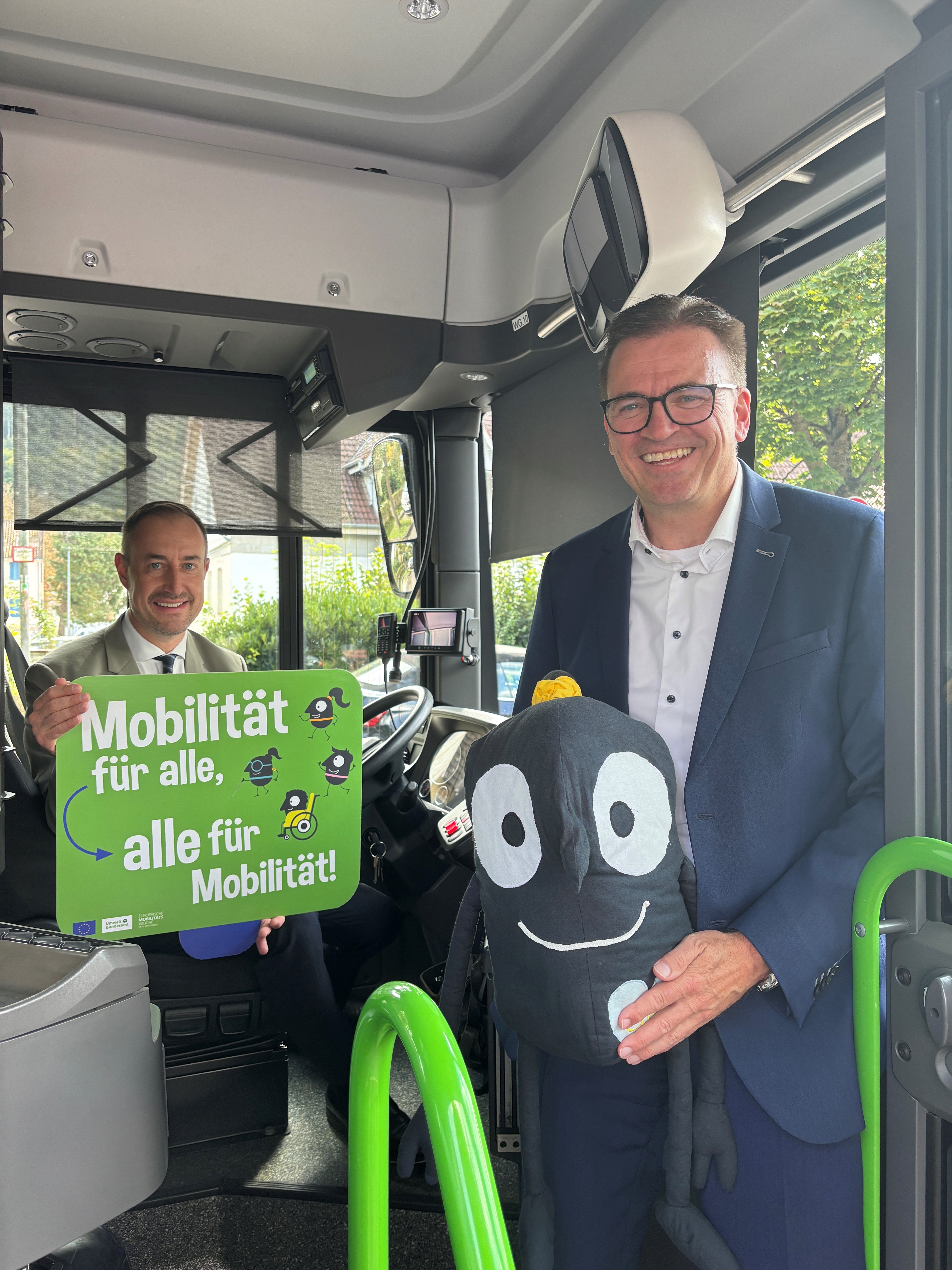 Der Landkreis Göppingen und der Ostalbkreis setzten gemeinsam ein Zeichen für nachhaltige Mobilität: Sie bewarben die Schnellbuslinie X93, die zwei Bahnstecken verbindet, und das örtliche Carsharing, indem die zwei Landräte gemeinsam mit Bürgermeister*innen und Vorständen der Verkehrsverbünde den Bus wie auch das Carsharing ausprobierten.