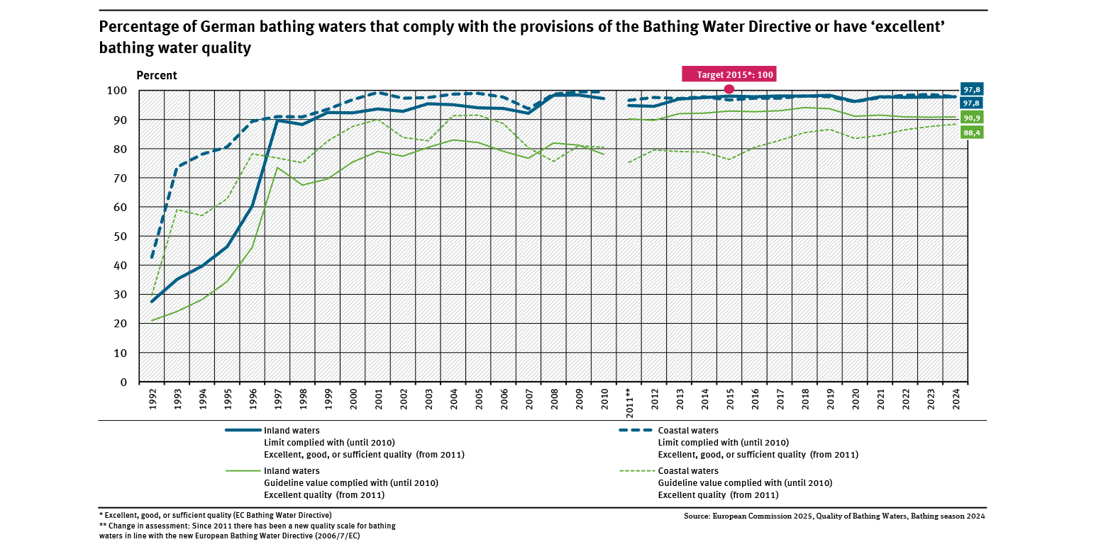 The indicator is based on the hygienic quality of the bathing water by measuring the level of faecal bacteria in the water. Bathing waters with high concentrations of these bacteria are at risk of also having pathogens present. These can cause diseases involving fever, sickness and diarrhoea. This risk is present after heavy rain, for instance, as a result of combined waste water overflow from sewage treatment plants or runoff from agricultural land. Another problem arises as a result of high temperatures and high nutrient discharges (especially phosphates). These can lead to a mass development of cyanobacteria. If these bacteria occur in large numbers, measures have to be taken. The presence of cyanobacteria is, however, not included in the quality assessment.