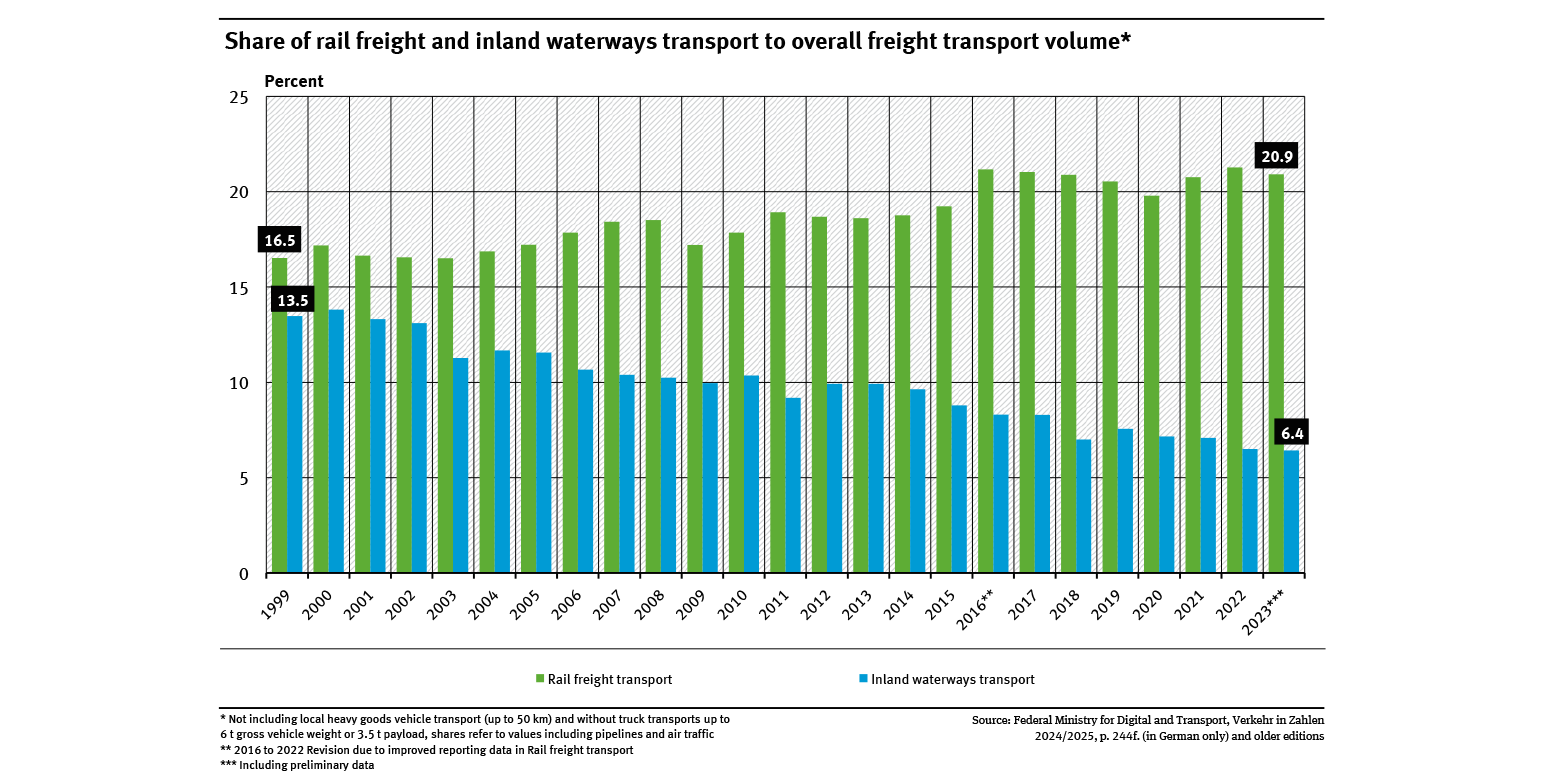 The long-term development of rail freight transport was positive. Its share increased slightly between 1999 and 2015 from 16.5 % to 19.2 %. From 2016, there was a jump due to a change in the data basis and in recent years the proportion has fluctuated between 19 and 21.5 %. In inland waterways transport, the trend has been clearly negative. Between 1999 and 2023, its freight transport market share fell almost continuously. Overall, the share of freight transport by rail and inland waterways in total freight transport volume has declined slightly due to the strong growth of road freight transport.